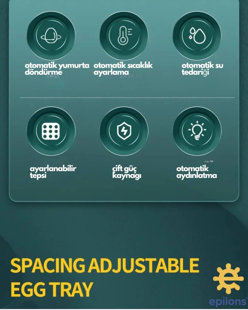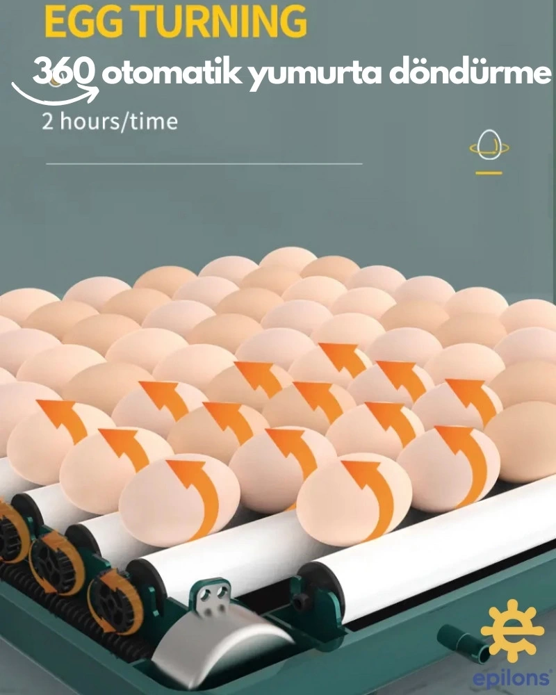 Epilons, profesyonel yetiştiriciler için geliştirdiği 130 yumurtalık tam otomatik kuluçka makinesi ile yüksek verim ve güvenilir kullanım sunar. Bu modelde Wi-Fi kamera hediyesi ile yumurtalarınızı uzaktan izleyebilirsiniz.
