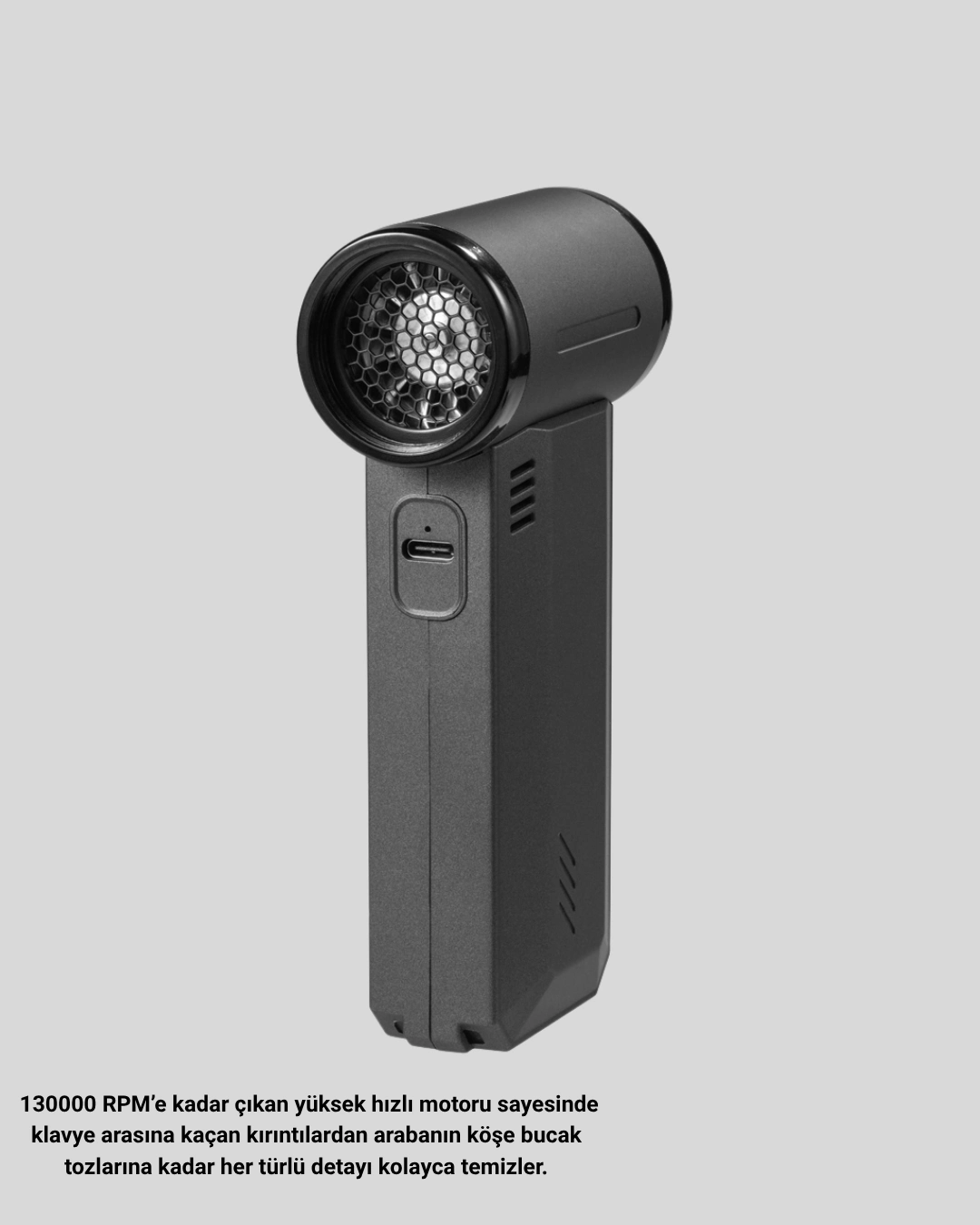 Ev, ofis ve araç temizliğinde devrim yaratan bu çok fonksiyonlu hava üfleme ve vakum cihazı, güçlü motoru ve kompakt yapısıyla temizlik anlayışınızı değiştiriyor.130000 RPM yüksek hızlı motor, en ulaşılmaz köşelerdeki tozları, kırıntıları ve kirleri saniyeler içinde temizler.Klavye aralarından araç içi döşemelere, ofis masasından pencere aralıklarına kadar her alan için mükemmel çözüm sunar.Üç kademeli hız ayarı, ihtiyacınıza göre farklı güç seviyelerinde temizlik yapmanızı sağlar.Şarj edilebilir batarya uzun kullanım süresi sunarken, Type-C hızlı şarj girişi sayesinde cihazı kısa sürede tekrar kullanıma hazır hale getirebilirsiniz.Kutu içeriğinde bulunan farklı başlıklar, dar ve geniş alanlar için özel temizlik imkânı sunar.Ayrıca, hava üfleme modu sayesinde yaz aylarında mini vantilatör olarak da kullanılabilir.Dayanıklı dış gövdesi uzun ömürlü kullanım garantisi verir.Hafif, taşınabilir ve güçlü yapısıyla her an yanınızda bulunması gereken çok yönlü bir temizlik yardımcısıdır.