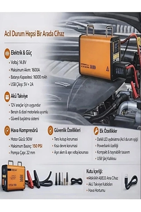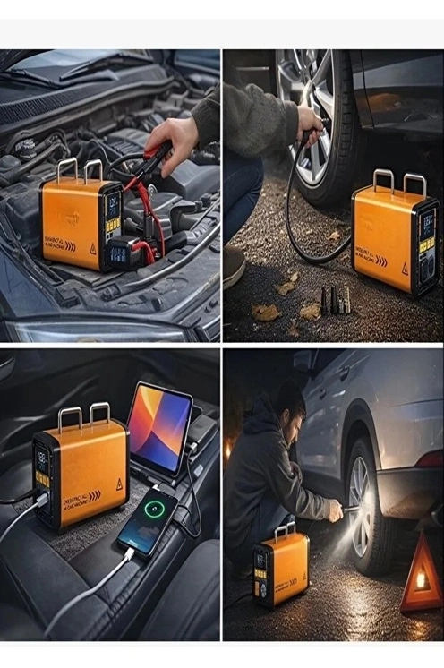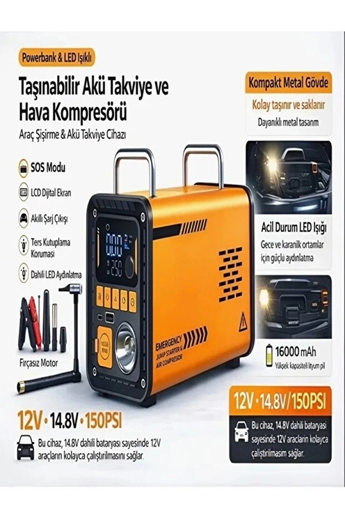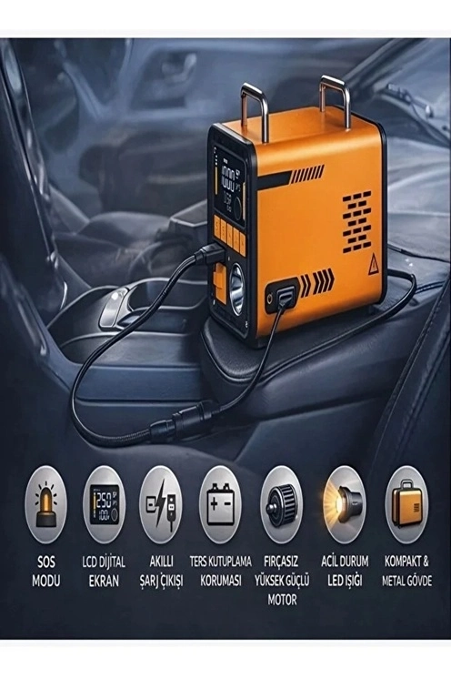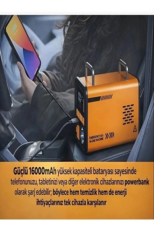 Yolda kaldığınızda ihtiyacınız olan her şey tek cihazda: akü takviyesi, lastik şişirme, mobil şarj, LED aydınlatma, Hava Üfleme ve Vakumlama