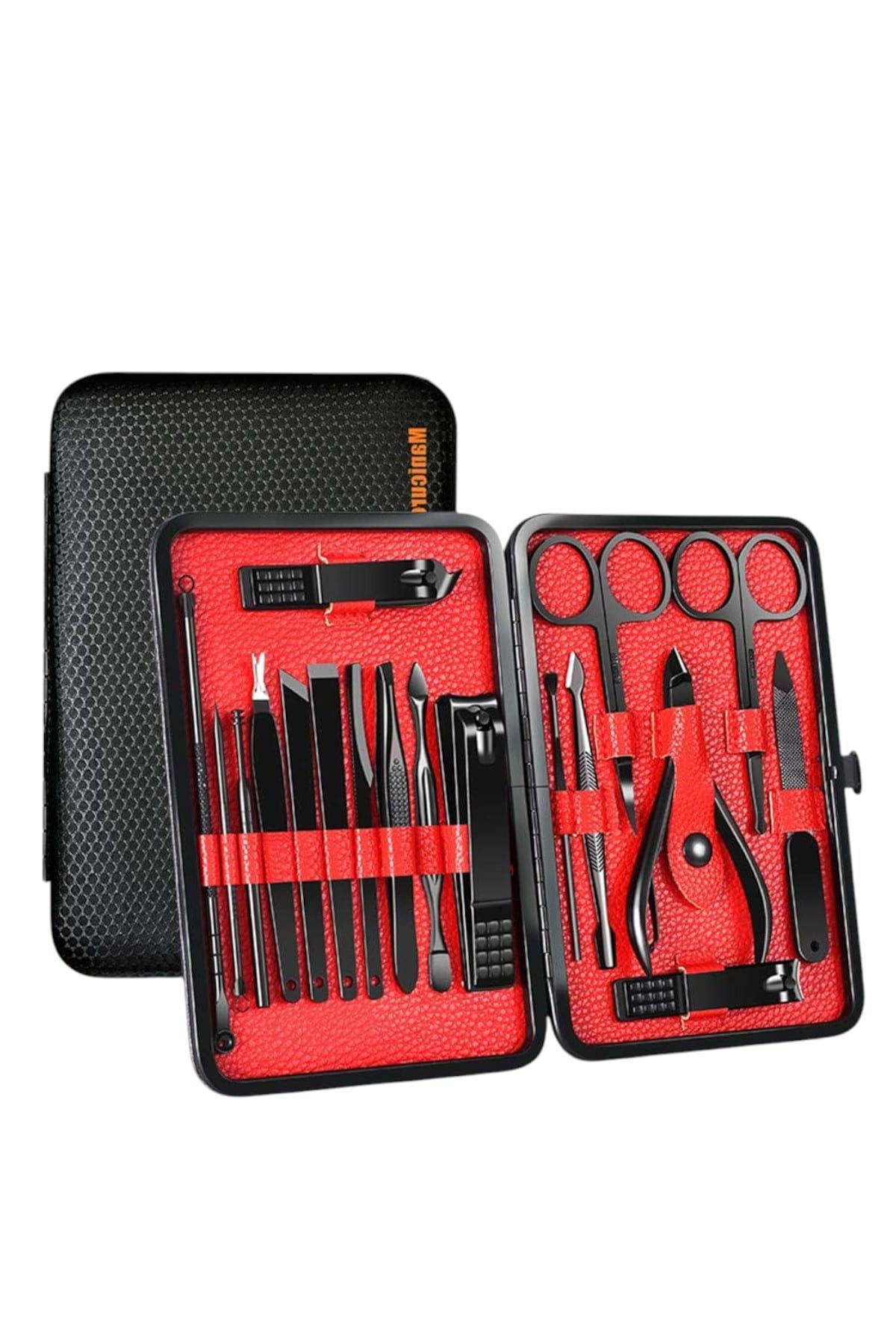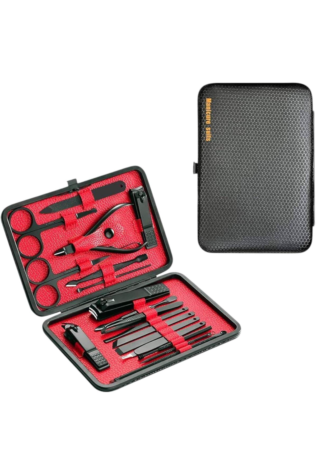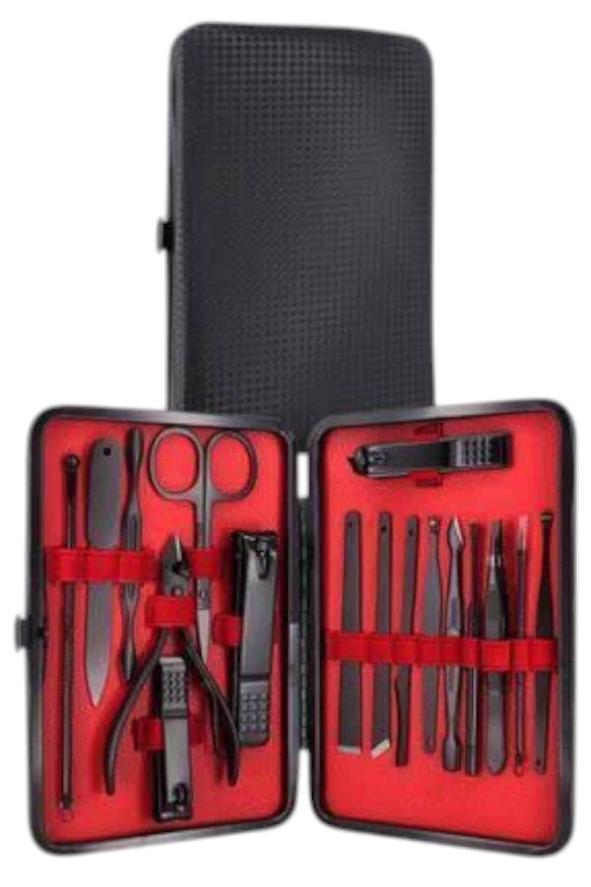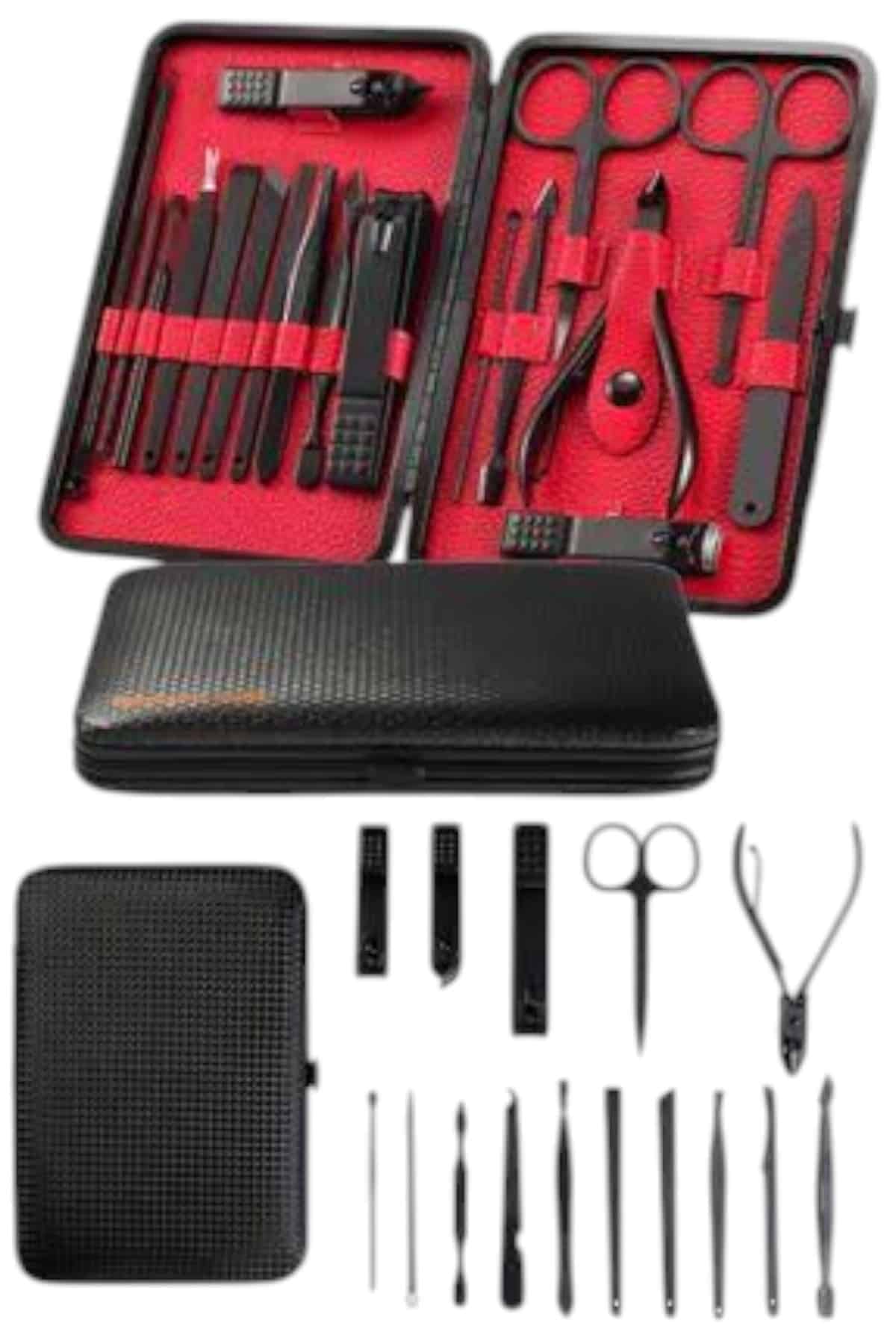 KESGİN MARKET® Özel tasarımıyla dikkat çeken bu 17 parçalık manikür seti, el ve ayak bakımınızı profesyonelce yapmanız için tüm gerekli malzemeleri bir araya getiriyor. Paslanmaz çelikten üretilmiş dayanıklı ve uzun ömürlü parçaları sayesinde güvenli sterilizasyon sağlar, kolay temizlenir ve korozyonu önleyerek hijyenik bir kullanım sunar. Yeni nesil siyah kaymaz parlatma teknolojisi ile üretilmiş keskin ve ergonomik tasarımı, kullanım kolaylığı ve estetik görünümü bir araya getirir.Şık ve sağlam deri kaplama kutusu sayesinde düzenli bir şekilde saklanabilir ve tek düğmeyle kolayca açılıp kapanabilir. Hafif ve taşınabilir yapısıyla çantanızda rahatça taşıyabilir, günlük kullanım veya seyahatlerinizde yanınızda bulundurabilirsiniz. Setin içeriğinde büyük, küçük ve sivri uçlu tırnak makasları, çift uçlu komedon, törpü, et ittirici, çift taraflı tırnak kaldırma aleti, makas, pedikür bıçakları, V şeklinde et itme aparatı, tırnak temizleme çubuğu, cımbız, iğneli komedon ve kulak temizleme aparatı bulunmaktadır.Her detayı düşünülerek tasarlanmış bu manikür seti, hem kendi bakımınızı pratik şekilde yapmanızı sağlar hem de sevdiklerinize hediye edebileceğiniz şık ve kullanışlı bir alternatif sunar.