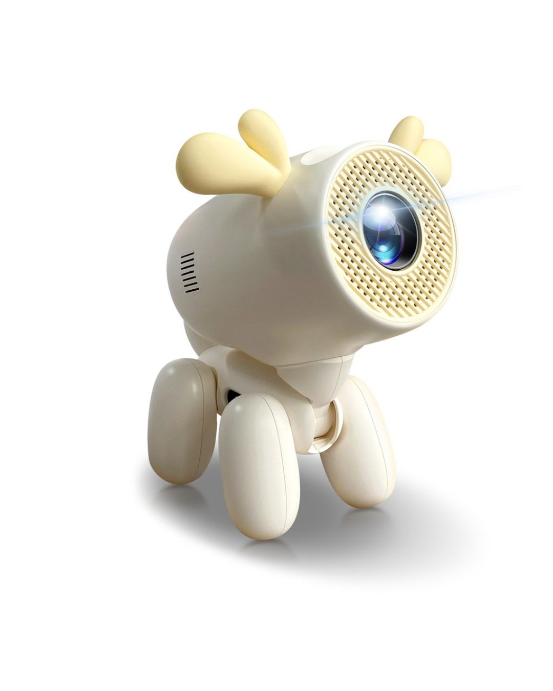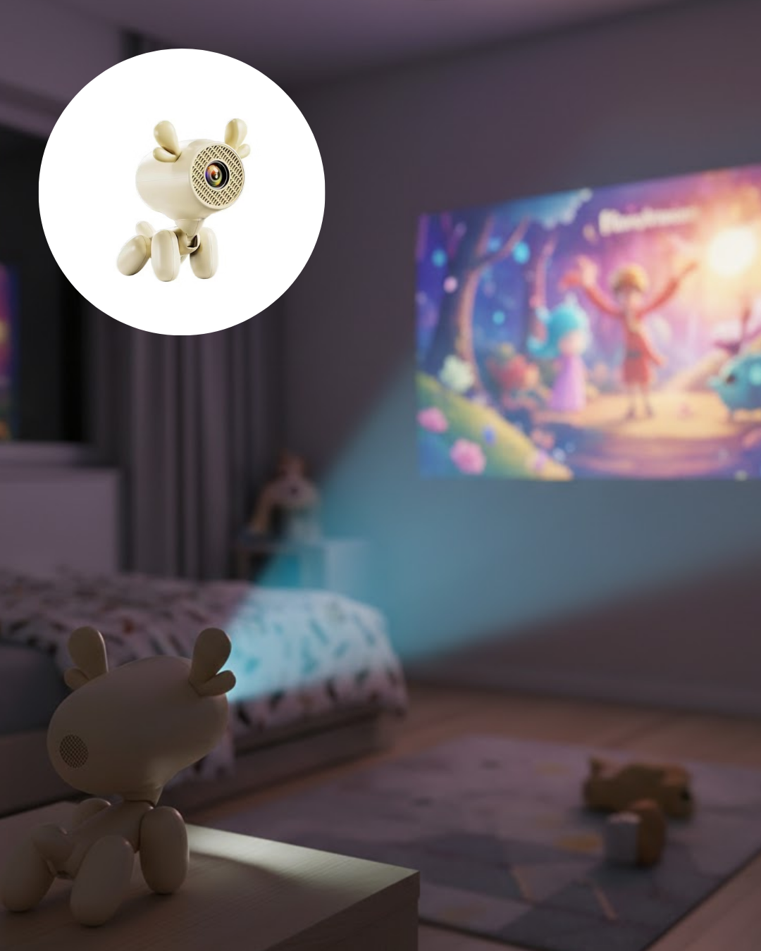 Akıllı mini projeksiyon cihazı, 4K içerik desteği ve 500 ANSI lümen parlaklık seviyesi ile ev sinema deneyimini bir üst seviyeye taşır. Kompakt ve sevimli tasarımı sayesinde hem dekoratif hem işlevsel bir üründür. Geyik figürlü gövde tasarımı özellikle çocuk ve genç odalarında dikkat çekici bir atmosfer oluşturur.Döner başlık mekanizması sayesinde projeksiyon açısı kolayca ayarlanabilir. Tavana yansıtma özelliği özellikle yatakta film izlemek isteyen kullanıcılar için büyük avantaj sağlar. Entegre stand yapısı sayesinde ek tripod gerektirmez.Android işletim sistemi ile popüler streaming uygulamalarına doğrudan erişim sağlanır. WiFi bağlantısı ile online içerik izlenebilir. Bluetooth desteği ile kablosuz hoparlör veya kulaklık bağlantısı yapılabilir. HDMI ve USB girişleri farklı cihaz bağlantısına imkan tanır.36W Dolby destekli hoparlör sistemi güçlü ve dengeli ses performansı sunar. Bu özellik cihazı hem projeksiyon hem ses sistemi olarak kullanma avantajı sağlar.
