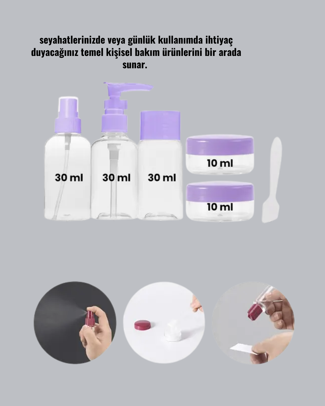 KESGİN MARKET®Seyahat Banyo Seti 5 Parça, pratik ve düzenli kullanım isteyenler için tasarlanmış kompakt bir bakım setidir. İçeriğinde 30 ml’lik bir şişe, sprey şişe, şampuanlık ve iki adet krem kutusu bulunur. Tüm parçalar pratik taşıma çantası ile birlikte gelir ve çanta içi düzeni sağlar. Şeffaf gövdeler sayesinde hangi şişede ne olduğunu kolayca görebilirsiniz. Ayrıca kapaklar sızdırmaz yapıdadır ve seyahat sırasında dökülmeleri engeller. Hafif ve minimal tasarımı sayesinde her çantaya uyum sağlar. Uçak kabin kurallarına uygun olduğu için el bagajında taşımaya uygundur. Spor salonu, ofis, okul veya günlük dışarı çıkışlarda kullanılabilecek ideal boyuttadır. Renkler karışık gönderilir ve kullanıcıya modern bir görünüm sunar. Hem estetik hem de fonksiyonel yapısıyla kişisel bakım ihtiyaçlarına en pratik çözümü sunar.