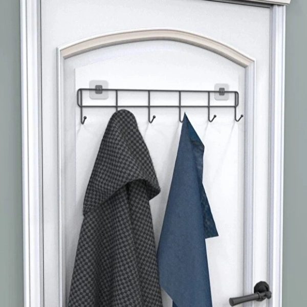 6'LI YAPIŞKANLI KAPI ARKASI ASKIÜrün Özellikleri6'lı yapışkanlı kapı arkası askı, ev ve ofis düzenini pratik şekilde sağlamak isteyenler için tasarlanmış fonksiyonel bir depolama çözümüdür. Delme veya vidalama gerektirmeyen yapışkanlı kapı arkası askı tasarımı sayesinde kapı, dolap kapağı veya düz yüzeylere kolayca uygulanabilir. Toplam altı askı bölümüne sahip olan ürün; mont, ceket, çanta, havlu, bornoz ve aksesuar gibi eşyaların düzenli şekilde asılmasına imkân tanır. Dayanıklı metal gövdesi sayesinde günlük kullanımda sağlam duruş sergilerken, siyah renkli sade tasarımı ile her ortama uyum sağlar. Yaklaşık 45 cm genişliği sayesinde alanı verimli kullanır ve dar alanlarda bile yüksek depolama avantajı sunar. Ev, banyo, mutfak ve ofis gibi alanlarda tercih edilen çok amaçlı duvar askısı, düzenli ve toplu bir görünüm elde etmeye yardımcı olur.Ürün Teknik Özellikleri Özellik Açıklama Ürün Adı 6'lı Yapışkanlı Kapı Arkası Askı Askı Sayısı 6 adet Genişlik 45 cm Yükseklik 9 cm Malzeme Dayanıklı metal Montaj Yapışkanlı, delmesiz kullanım Kullanım Alanı Kapı arkası, dolap, duvar Kullanım Amacı Düzenleme ve asma çözümü Paket İçeriği1 adet 6'lı yapışkanlı kapı arkası askı