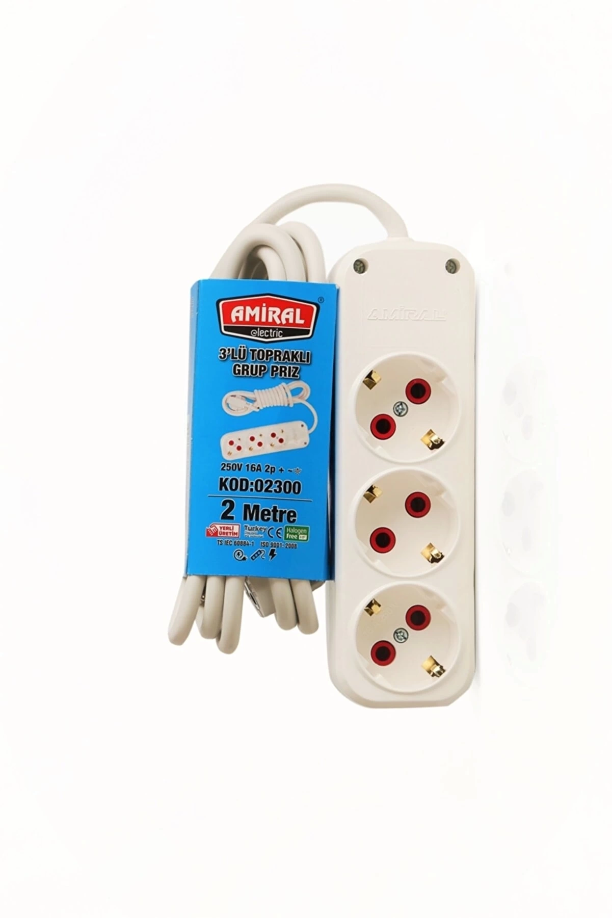 KESGİN MARKET® Amiral 3' Lü Topraklı Anahtarlı 2 Metre Kablolu Grup Priz