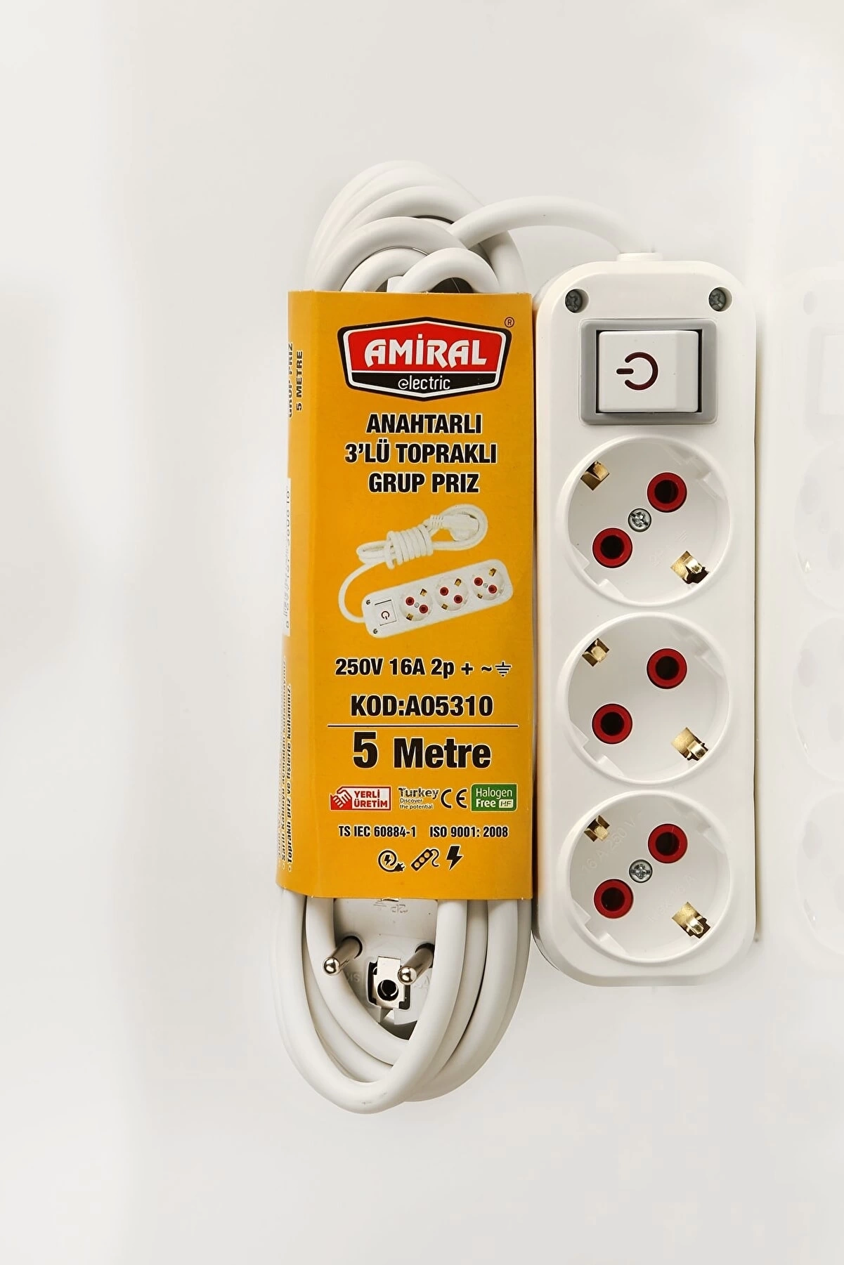 KESGİN MARKET® Amiral 3' Lü Topraklı 5 Metre Kablolu Grup Priz