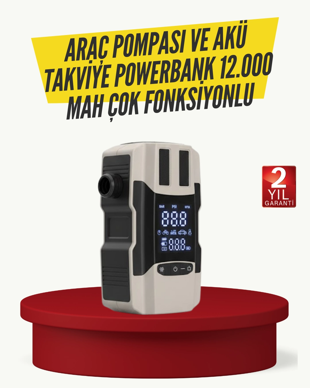Bu çok amaçlı araç cihazı, sürüş güvenliğini artırmaya yönelik olarak tasarlanmıştır. Dahili hava pompası ile lastikler kolayca şişirilebilir. Akü takviye özelliği, araç aküsünün zayıf olduğu durumlarda destek sağlar. Powerbank fonksiyonu sayesinde telefon, tablet gibi cihazlar şarj edilebilir. Dijital ekranı, kullanım sırasında net bilgi sunarak işlemleri kolaylaştırır.