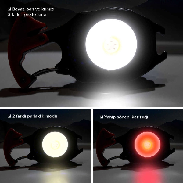 ÇOK FONKSİYONLU ANAHTARLIK KAMP LAMBASIÜrün ÖzellikleriÇok fonksiyonlu anahtarlık kamp lambası, kompakt yapısına rağmen sunduğu zengin özellikleriyle kamp, outdoor, acil durum ve günlük kullanım için ideal bir aydınlatma çözümüdür. Güçlü LED teknolojisi sayesinde yüksek parlaklık sunan bu ürün, 500 lümen güçlü ışık kapasitesi ile karanlık ortamlarda etkili görüş sağlar. Sahip olduğu 6 farklı ışık modu, farklı ihtiyaçlara göre ayarlanabilir aydınlatma imkânı sunarak kamp alanında, araç içinde veya ev kullanımında pratiklik sağlar. Anahtarlık formundaki askılı ve karabineli tasarımı sayesinde çanta, kemer veya anahtar üzerinde kolayca taşınabilir. Dahili çakmak, şişe açacağı, kesici bıçak ve tornavida uçları ile çok yönlü kullanım avantajı sunar. Güçlü mıknatıs özelliği sayesinde metal yüzeylere sabitlenerek eller serbest kullanım sağlar. Type-C bağlantı ile şarj edilebilen yapısı ve şarj göstergeli kamp lambası özelliği, kullanım sırasında enerji durumunu rahatça takip etmenizi sağlar. Su geçirmez gövde yapısı sayesinde zorlu hava koşullarında güvenle kullanılabilir ve outdoor aktivitelerde dayanıklı bir yardımcıdır.Ürün Teknik Özellikleri Özellik Açıklama Ürün Adı Çok Fonksiyonlu Anahtarlık Kamp Lambası Parlaklık 500 lümen Işık Modları 6 farklı aydınlatma modu Şarj Türü Type-C şarj edilebilir Ek Fonksiyonlar Çakmak, şişe açacağı, kesici bıçak, 2 adet tornavida, düdük Mıknatıs Güçlü mıknatıslı yapı Dayanıklılık Su geçirmez gövde Taşıma Anahtarlık ve karabine tasarımı Kullanım Alanı Kamp, outdoor, acil durum, günlük kullanım Paket İçeriği1 adet çok fonksiyonlu anahtarlık kamp lambası