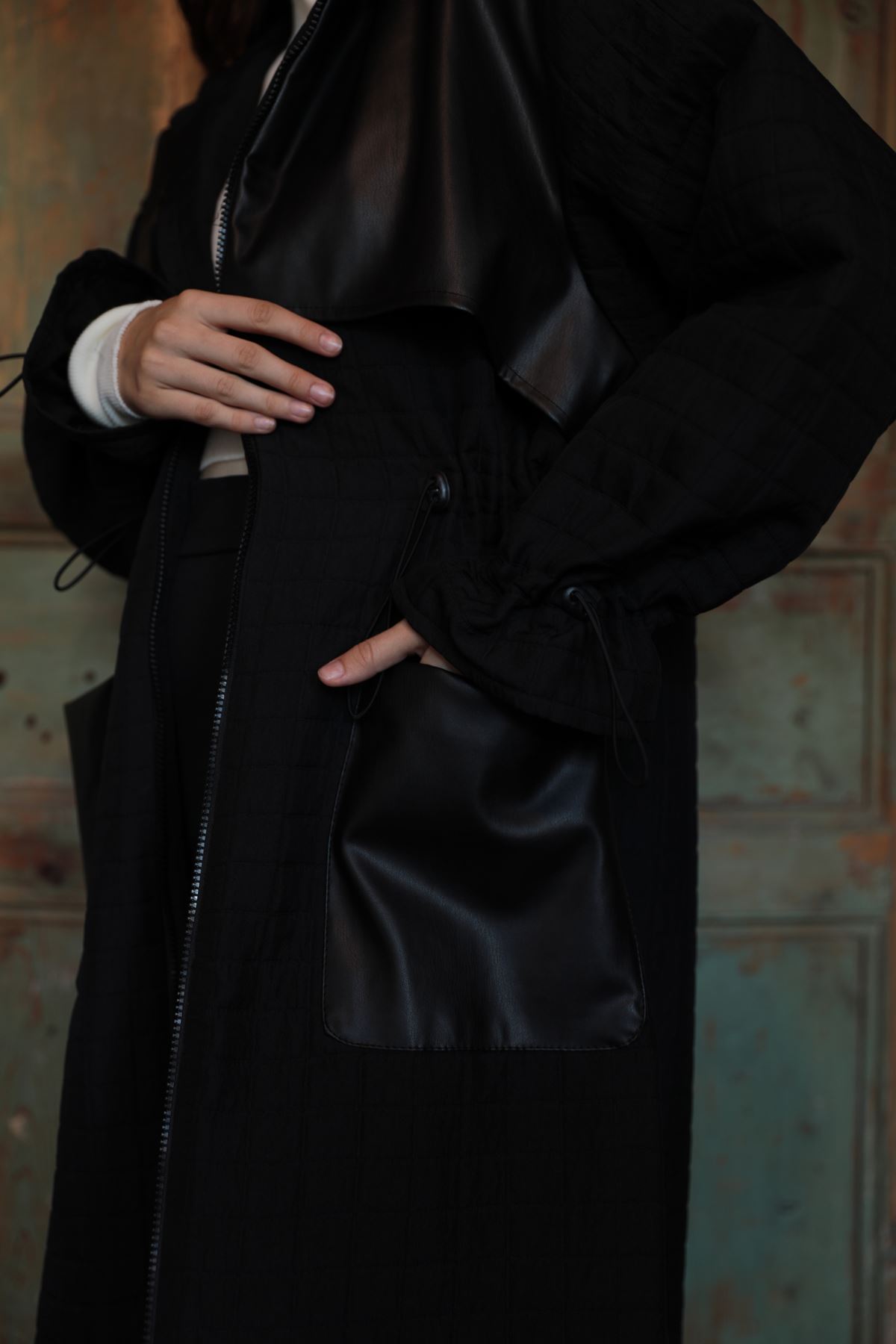 Zarif jakar kumaş ile deri garni detayları, güçlü ve sofistike bir görünüm sunarken, siyahın asil duruşu her ortamda dikkatleri üzerinize çeker.