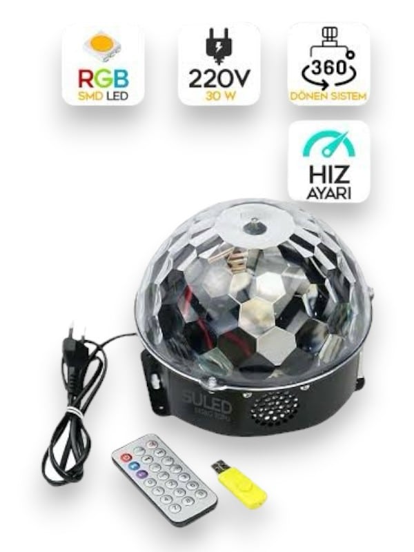 KESGİN MARKET® Sese Duyarlı Disko TopuSD Kart ve USB Girişli LED Disko Işıklı Speaker Hoparlör (Kumandalı)Müzik dinlemek hiç bu kadar eğlenceli olmamıştı.Odanızda müzik dinlerken ortama harika bir görsel şölen yaşatmaya ne dersiniz ?Partilerinizde ve kutlamalarınızda SD Kart ve USB Girişli LED Işıklı Kristal Yarım Küre var ise başka bir şeye ihtiyacıınz yoktur.SD Kart ve USB Girişli LED Işıklı Kristal Yarım Küre ile kırmızı, mavi ve yeşil olmak üzere 3 farklı renk kombinasyonu müzik ritmine ayak uyduruyor.SD kart veya USB Bellek desteğiyle istediğiniz şarkıyı SD Kart yada USB Belleğinize yükleyin ve kumanda sayesinde yada üzerinde yer alan tuşları sayesinde müziği başlatın.Müziğin ritmine göre içerisinde yer alan led lambalar hareketli olarak yanıp sönmeye başlayacaktır.Ürünü prize ilk taktığınızda sadece dönerek led ışık saçacaktır.Dahili hoparlör, iyi bir ses kalitesi Bulunduğu ortamı aydınlatan güçlü LED ışık Tak çalıştır sistemiyle prize taktığınız andan itibaren ürünü kolaylıkla çalıştırabilirsiniz.Uzaktan kumanda ile ses kontrolü ve müzikler arası geçiş rahatlıkla sağlanabilir.1,5 Kg ağırlığındadır.Paket içerisinden çıkan Hediye USB Bellek 128 MB hafızaya sahiptir.USB Bellek içerisinde toplam 17 adet deneme amaçlı müzik yüklüdür.İsterseniz USB Belleği bilgisayarınıza takıp içindeki müzikleri silip,yükleyebilirsiniz.