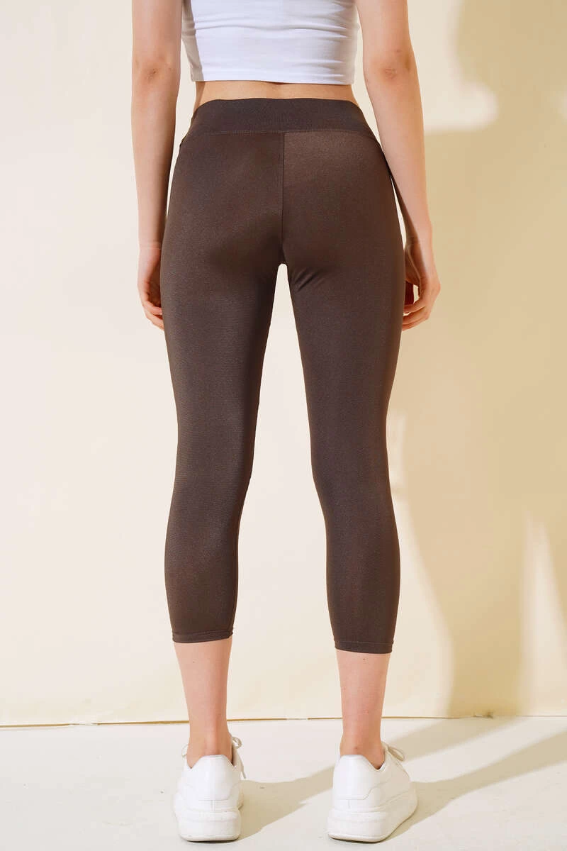 Esnek Yüksek Bel Kahverengi Uzun Parlak Disco Tayt