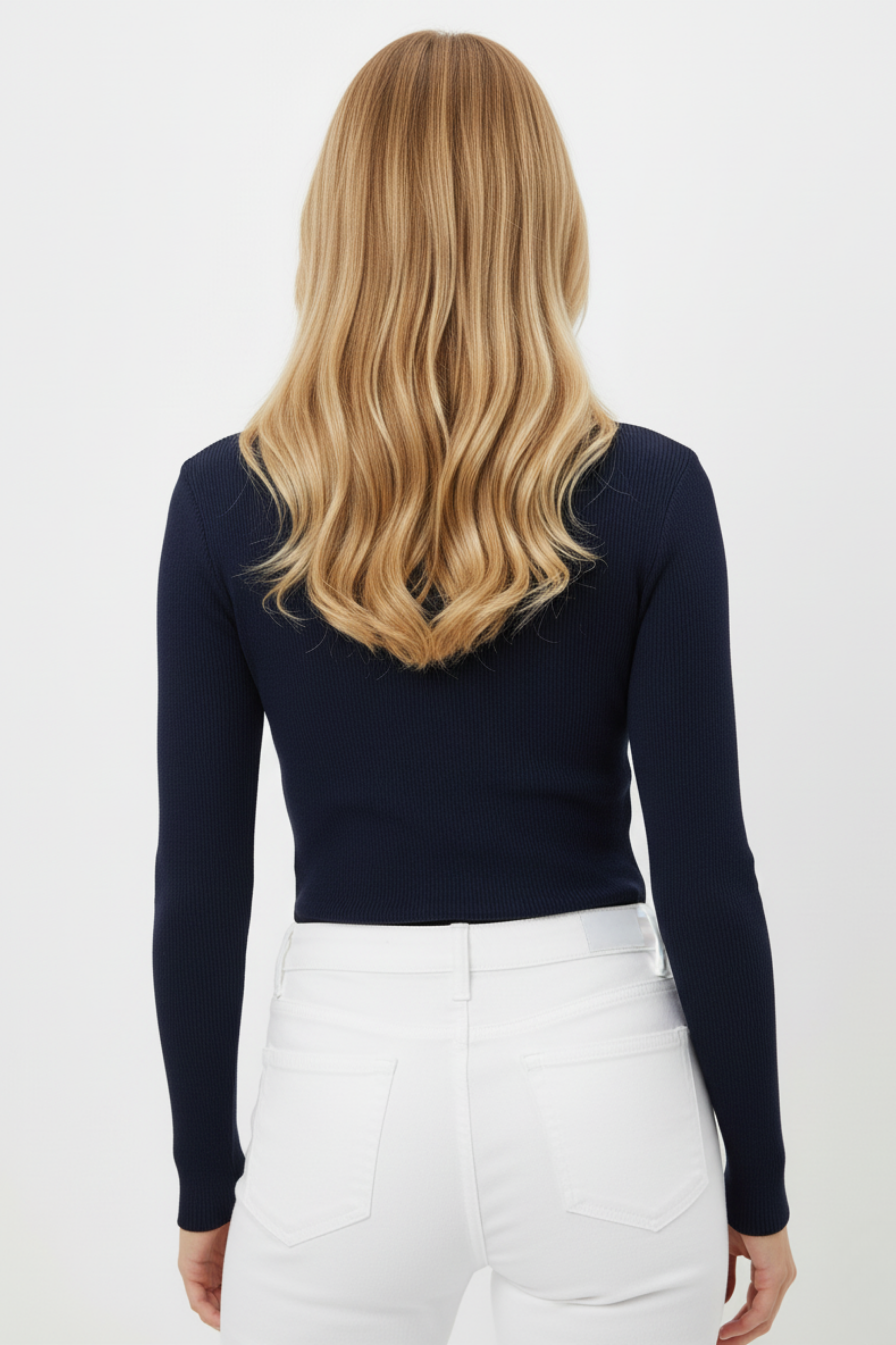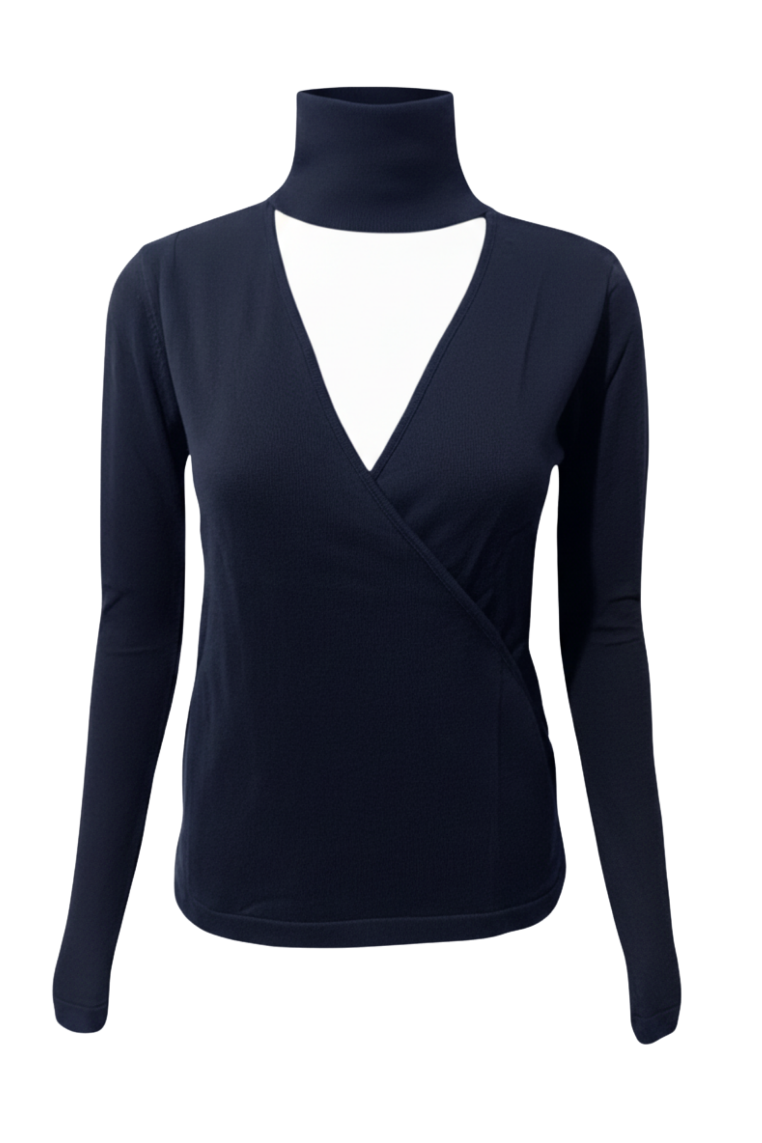 Klasik şıklığı modern dokunuşlarla buluşturan bu lacivert boğazlı pencere detaylı triko kazak, gardırobunuzun favori parçası olmaya aday. Boğazı saran yaka yapısı sayesinde soğuk havalarda sıcak tutarken, ön kısmındaki zarif pencere detayı feminen bir hava kazandırır.