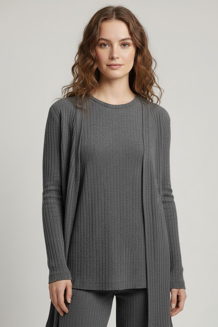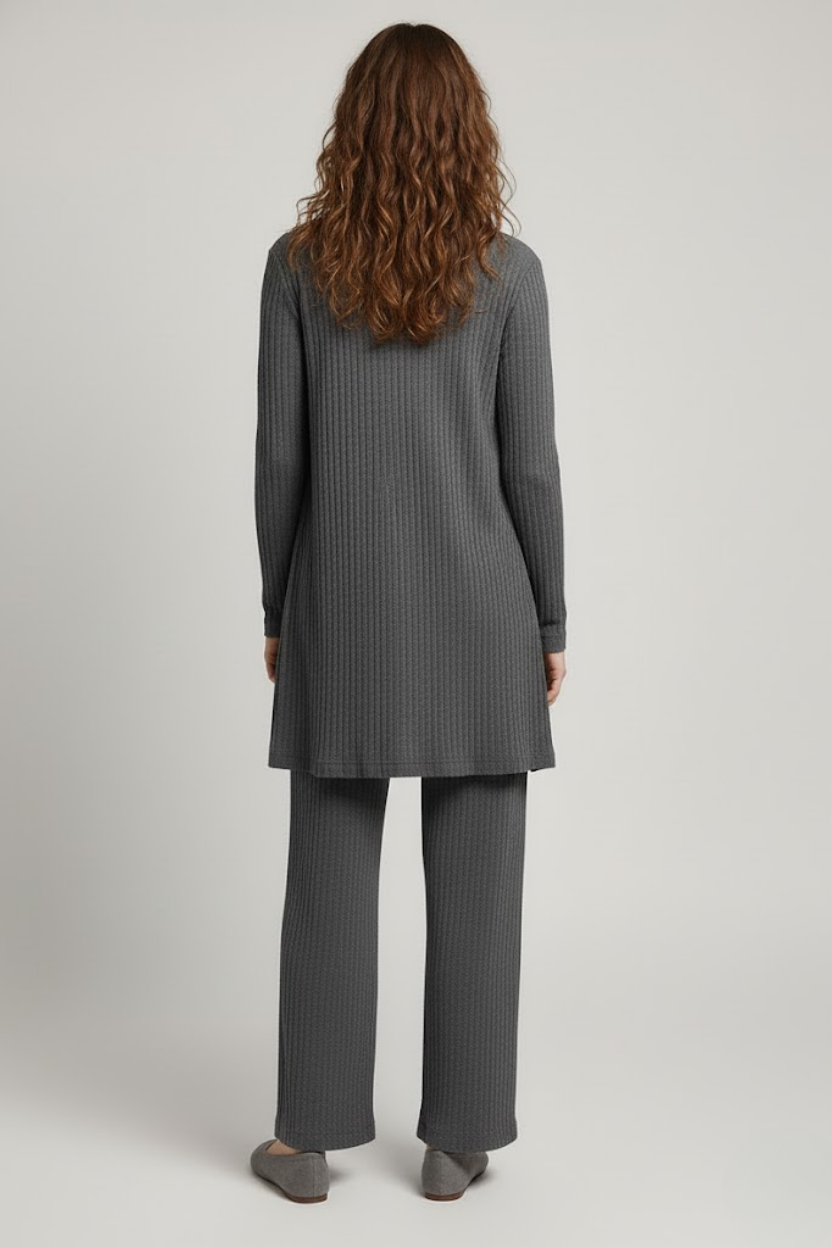 Gardırobunuzda hazır bir şıklık ve üst düzey konfor arayanlar için ideal olan bu Gri Ribanalı Üçlü Takım Kombini ile tanışın. Birbirini tamamlayan üç parçadan oluşan bu set hem günlük kullanımda hem de özel anlarınızda zahmetsiz bir zarafet sunar. Esnek ve dökümlü ribana dokusu sayesinde dört mevsim rahatlıkla tercih edilebilir.