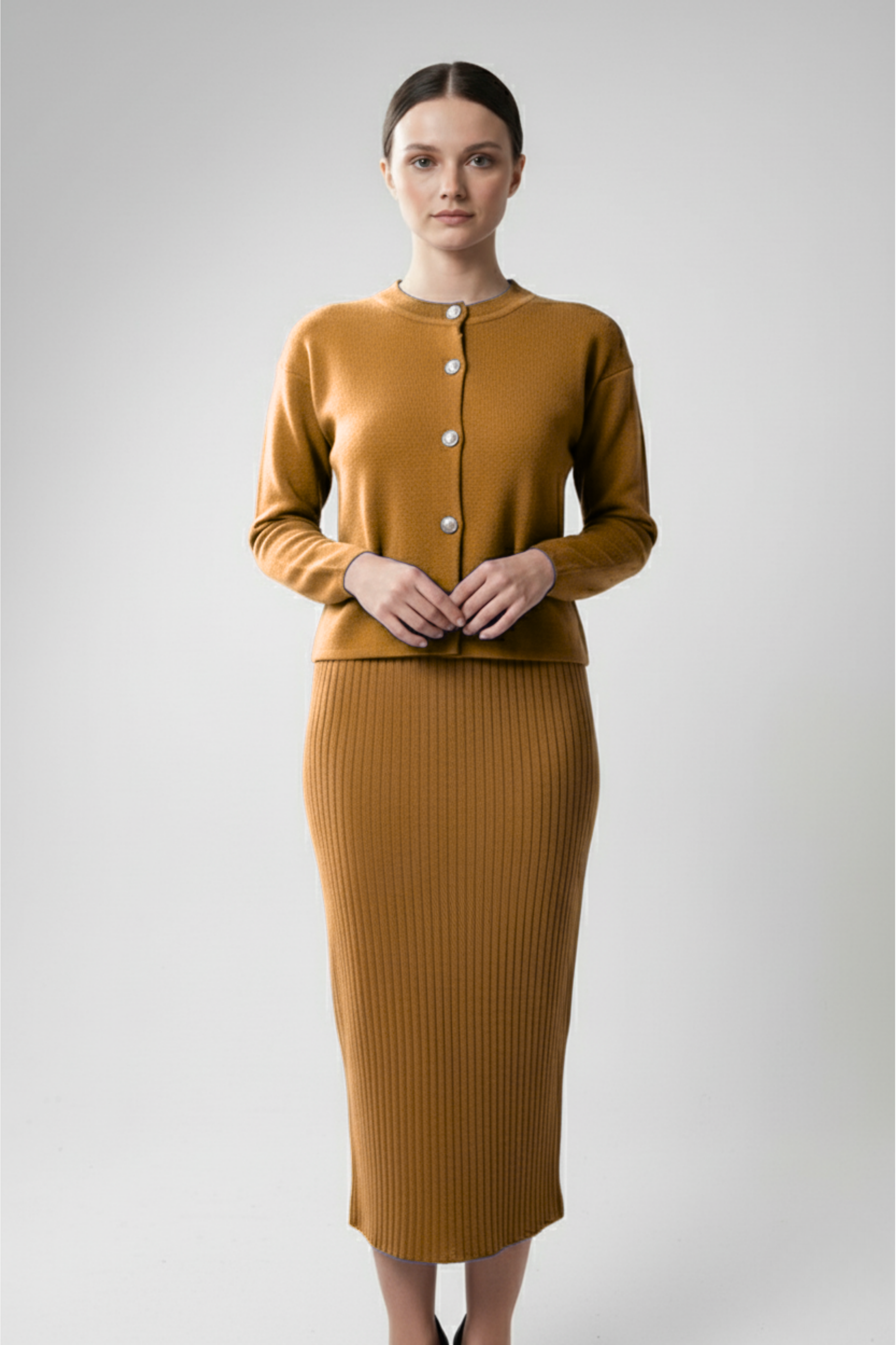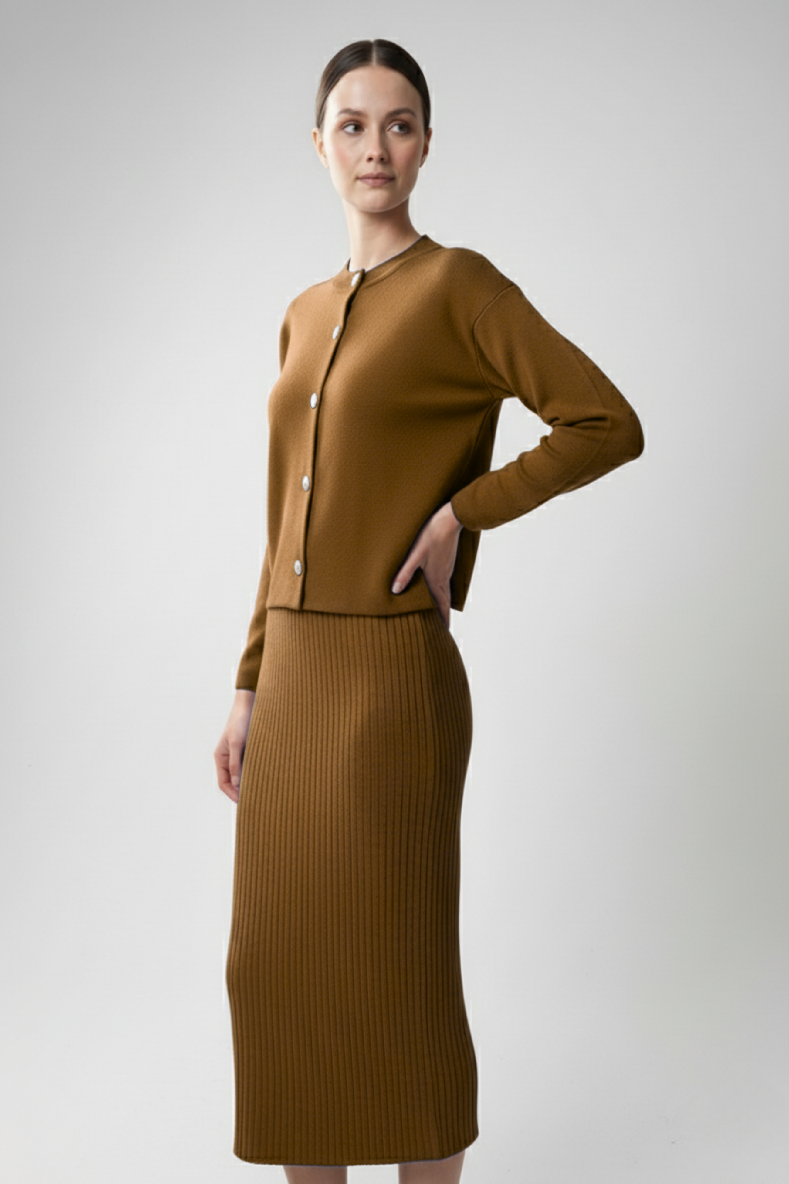 Kadın Hırka Elbise İkili Takım - Kahverengi, sıcak tonları ve zarif duruşuyla doğal şıklığın en zarif halini sunuyor. Kahverenginin toprak tonları, hem klasik hem de modern kombinlere uyum sağlarken, triko kumaşın yumuşak dokusu konforu ön plana çıkarır. Uzun hırka ve uyumlu elbise tasarımı, kusursuz bir bütünlük yaratarak zarif bir siluet oluşturur. Günlük kullanımdan özel buluşmalara kadar her ortamda sofistike bir görünüm isteyen kadınlar için mükemmel bir seçim!