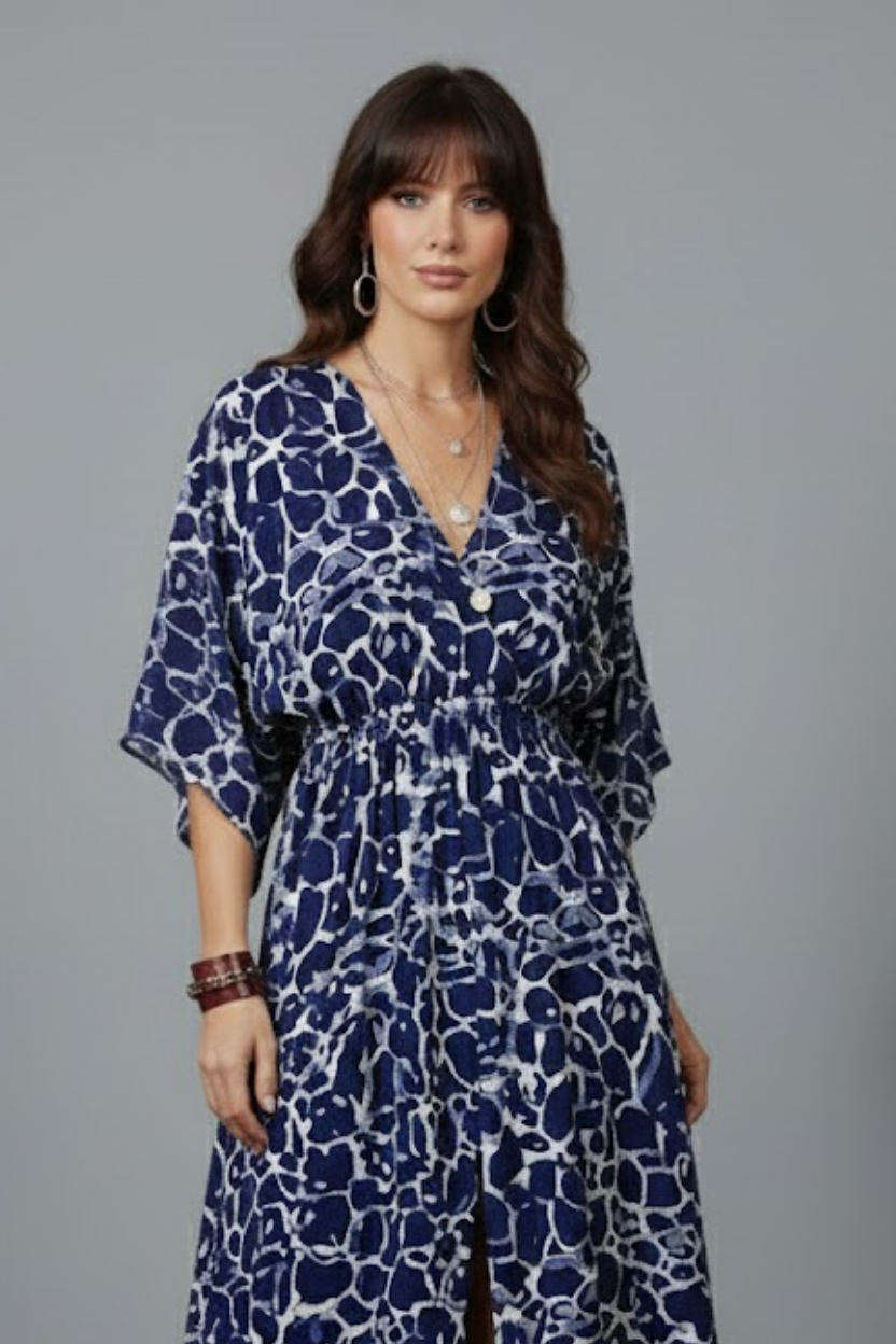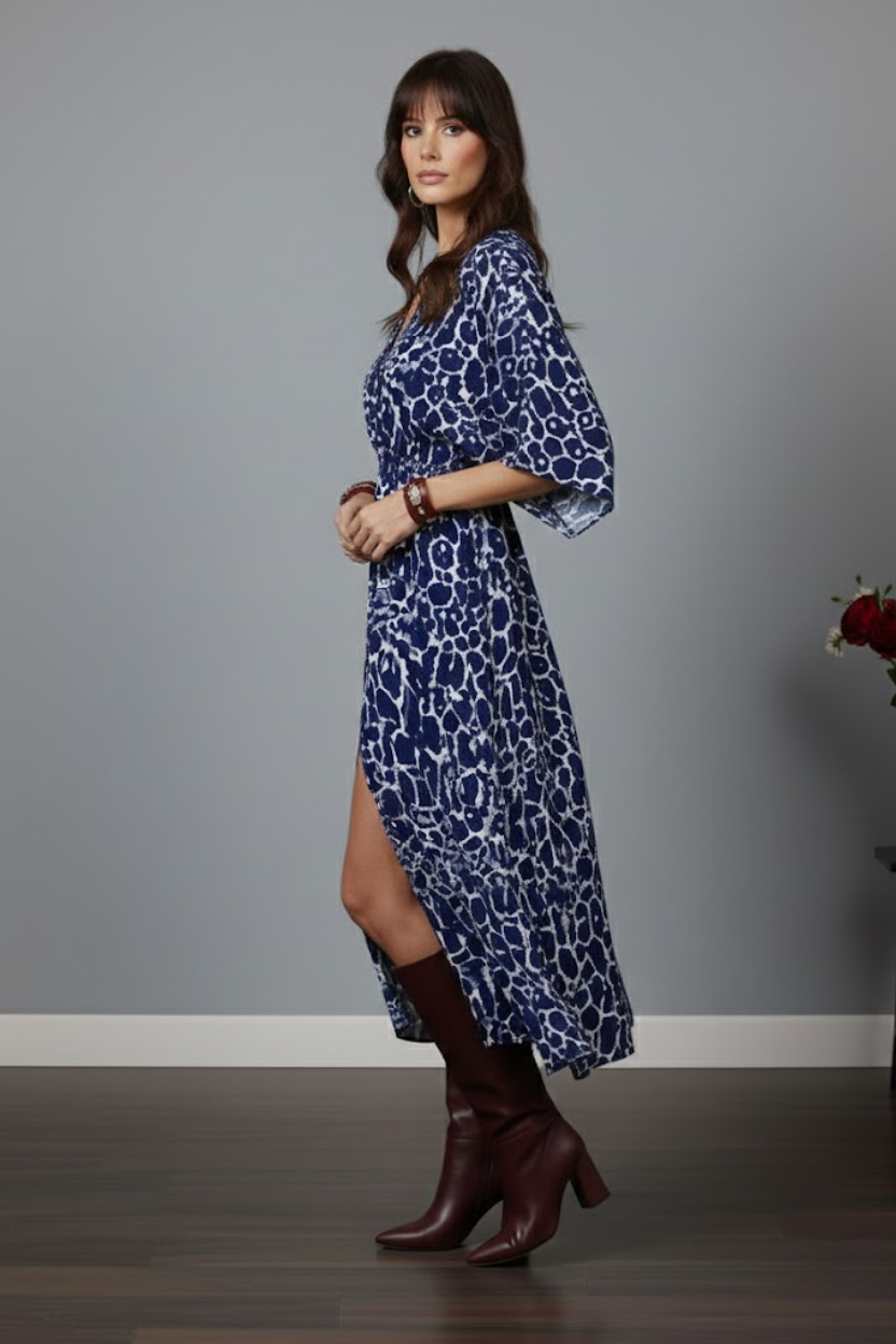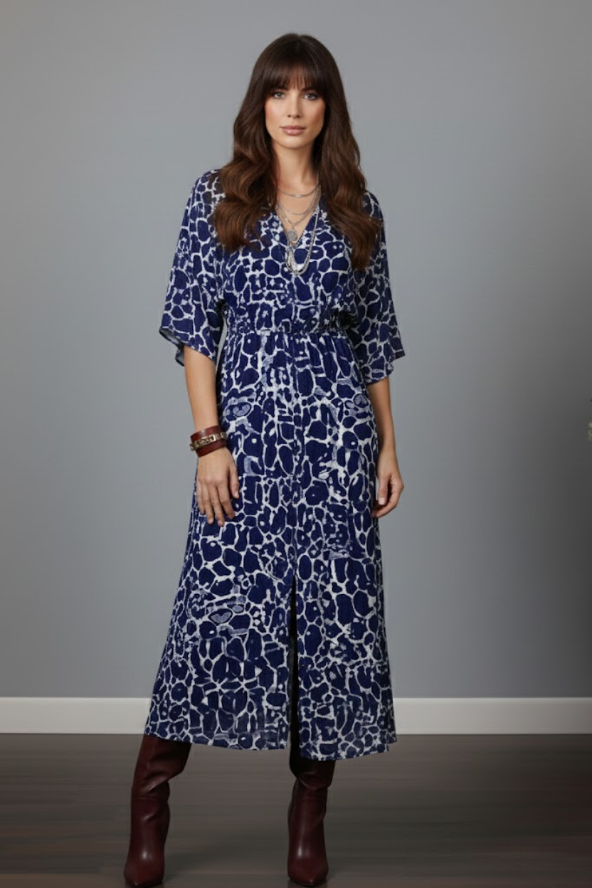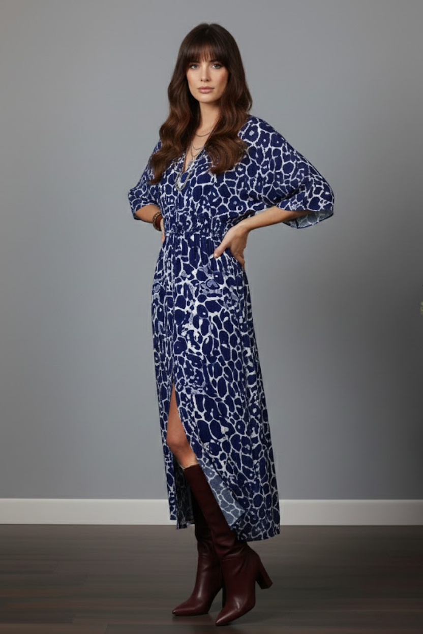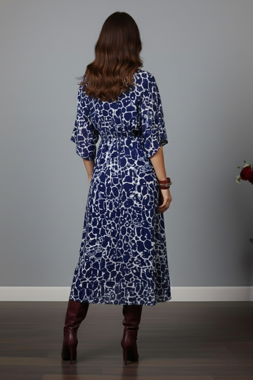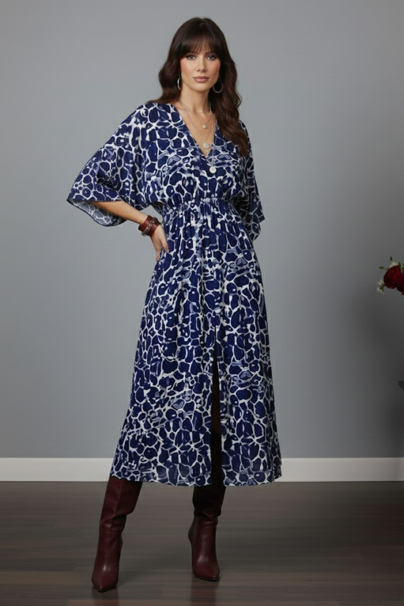 Zaman kazandıran şıklık ve konfor bir arada! Özel dokulu bürümcük kumaşı sayesinde ütü gerektirmeyen bu lacivert desenli uzun elbise, hem günlük hayatta hem de özel davetlerde zahmetsiz bir zarafet sunar.