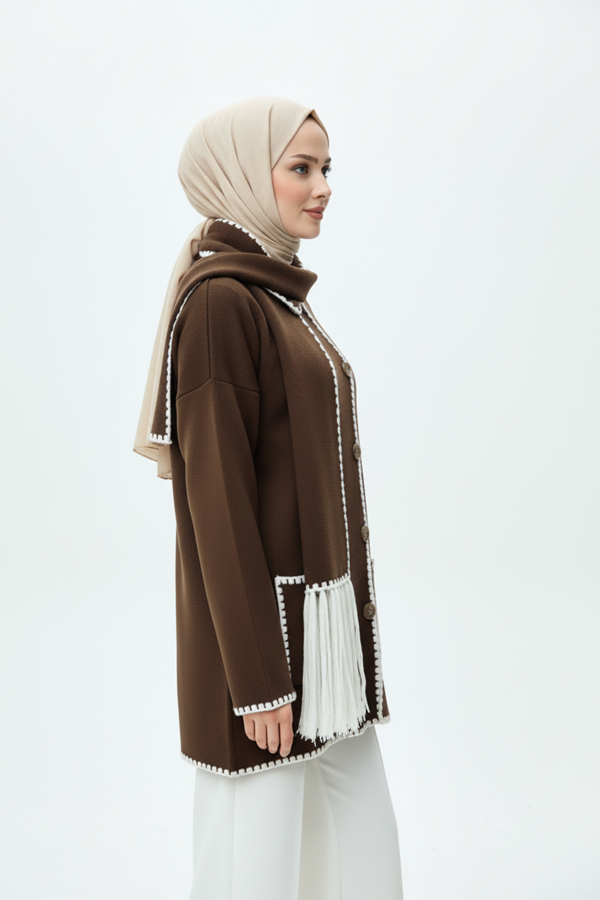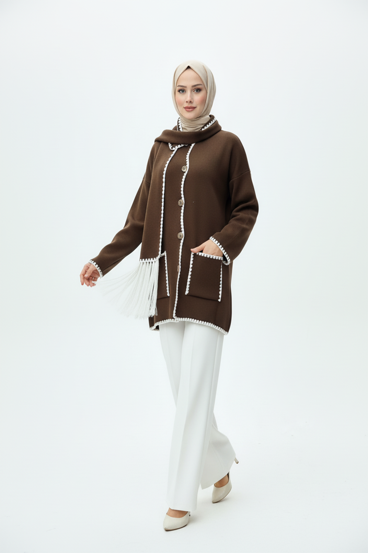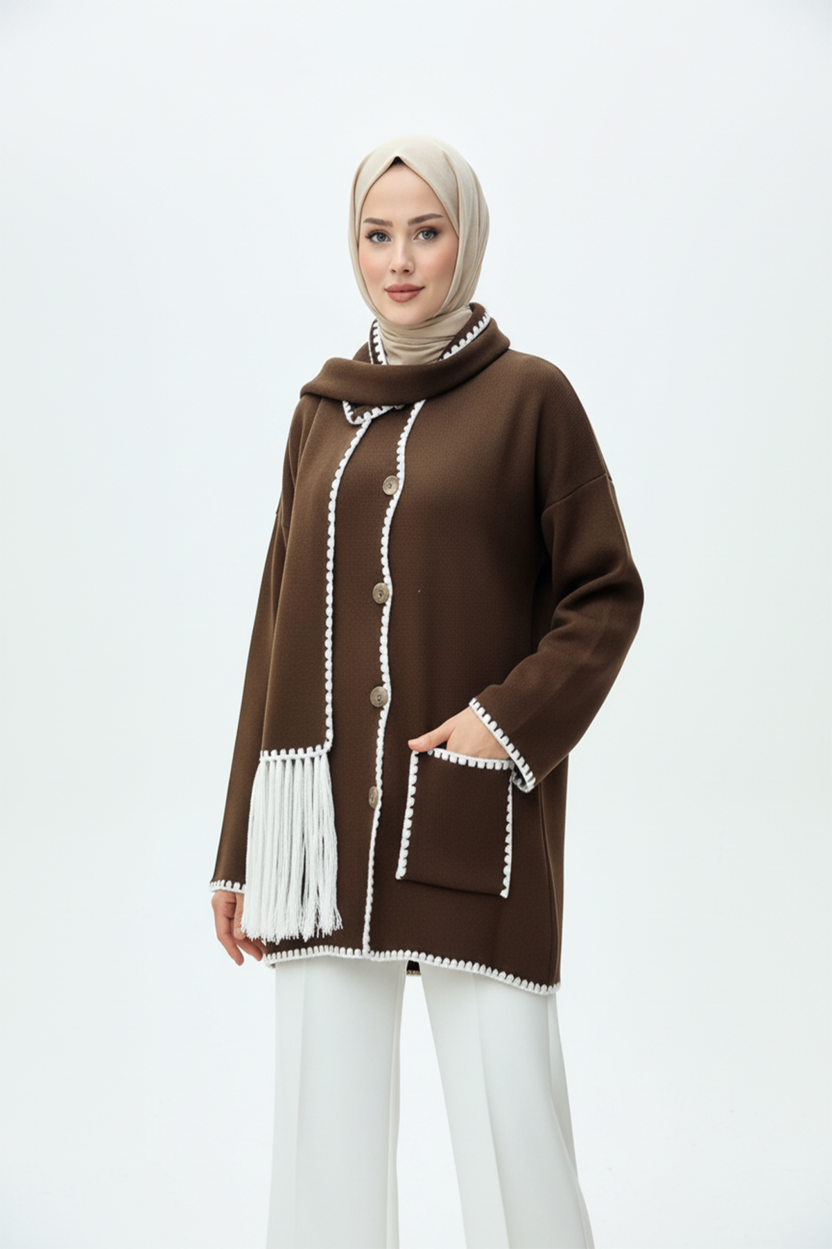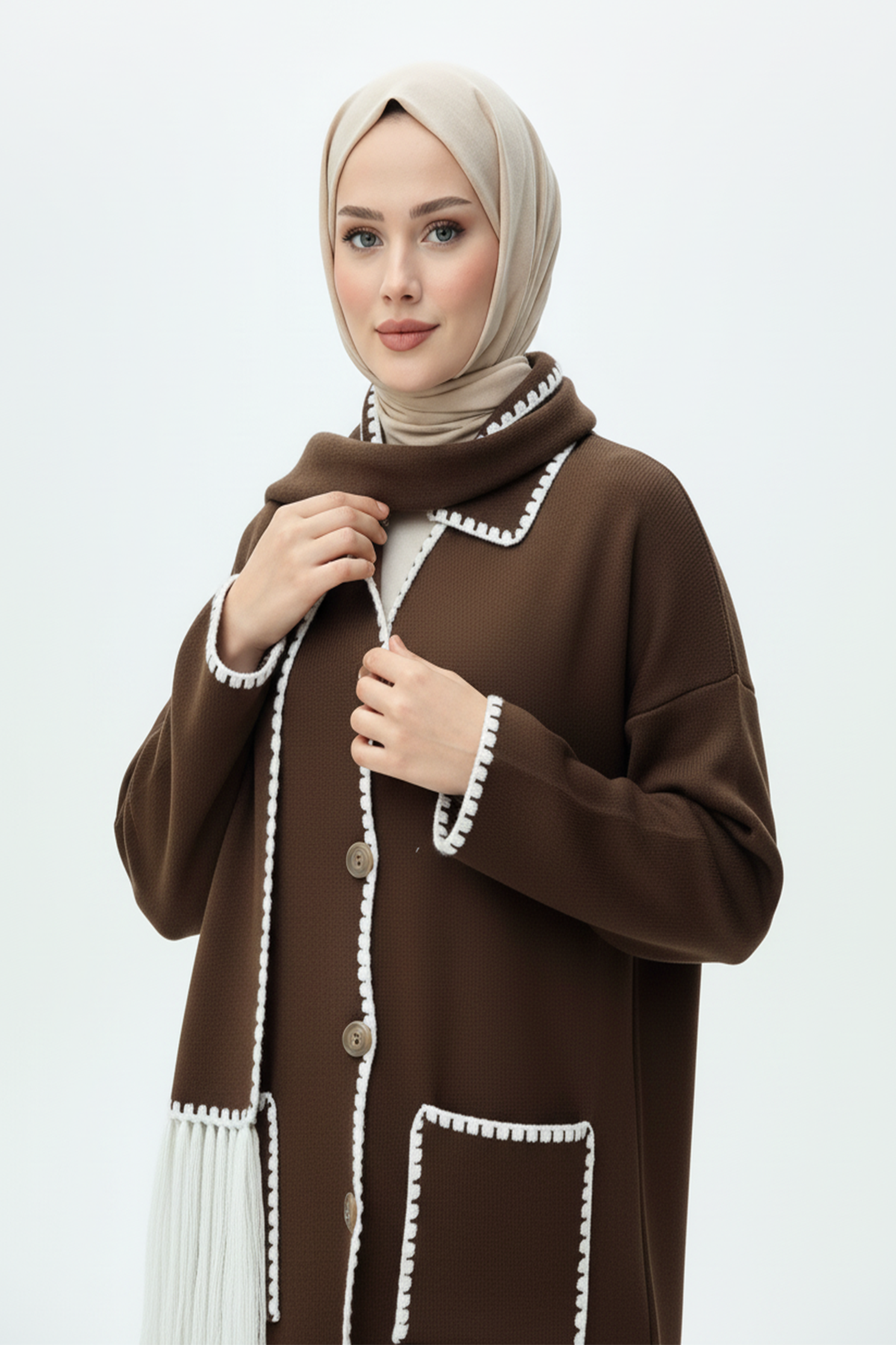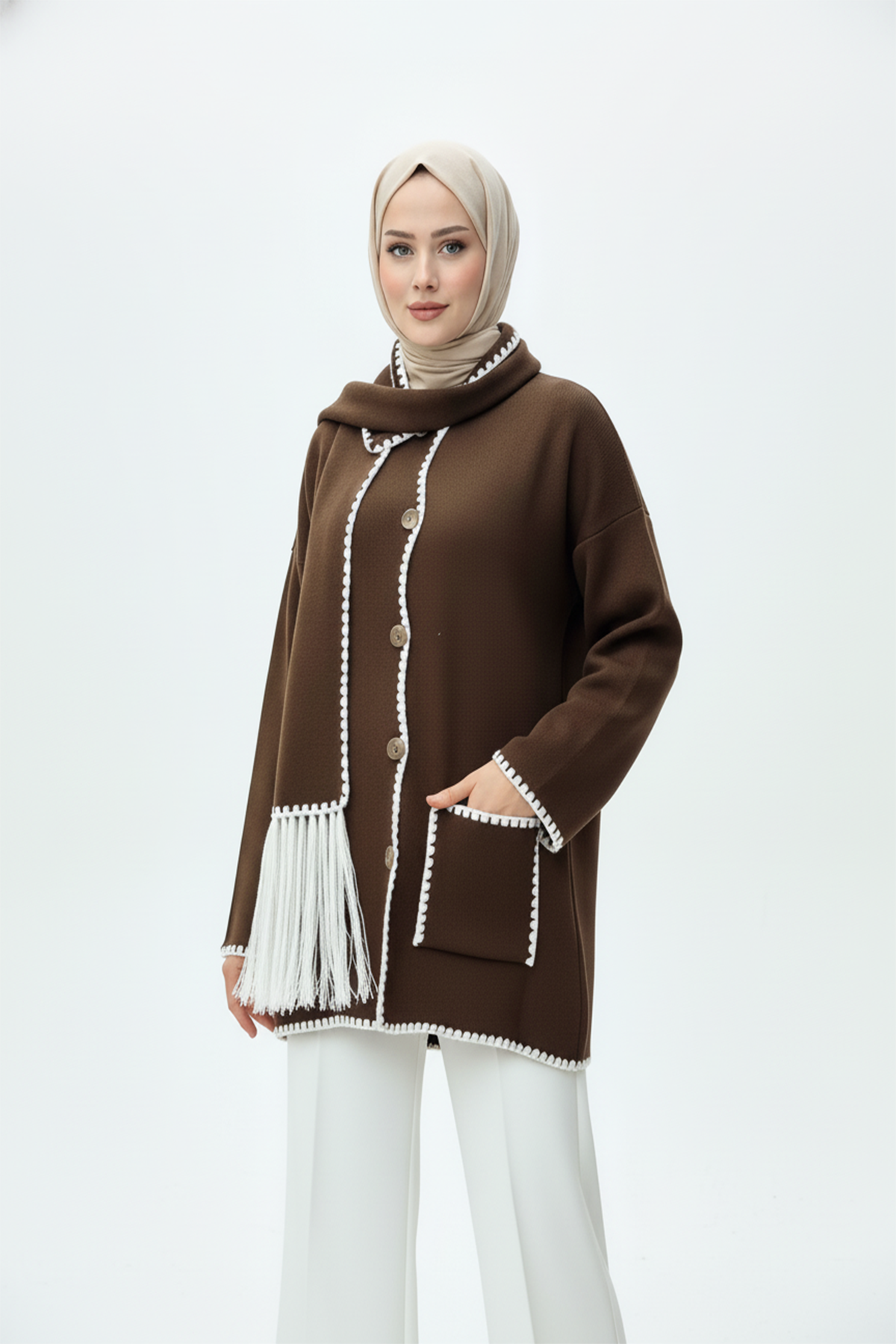 Kadın Nakış Detaylı Atkılı Yumuşak Ceket - Kahverengi, zarif detayları ve sıcak dokusuyla şıklığı konforla buluşturuyor. İnce nakış işlemeleri, cekete feminen bir zarafet katarken, yumuşak kumaşı gün boyu konforlu bir kullanım sağlar. Uyumlu atkı detayı, hem tarzınıza özgün bir dokunuş yapar hem de soğuk havalarda ekstra sıcaklık sunar. Kahverenginin doğal ve sofistike tonuyla, günlük kombinlerde ya da şehir stilinde fark yaratmak isteyen kadınlar için mükemmel bir seçim!