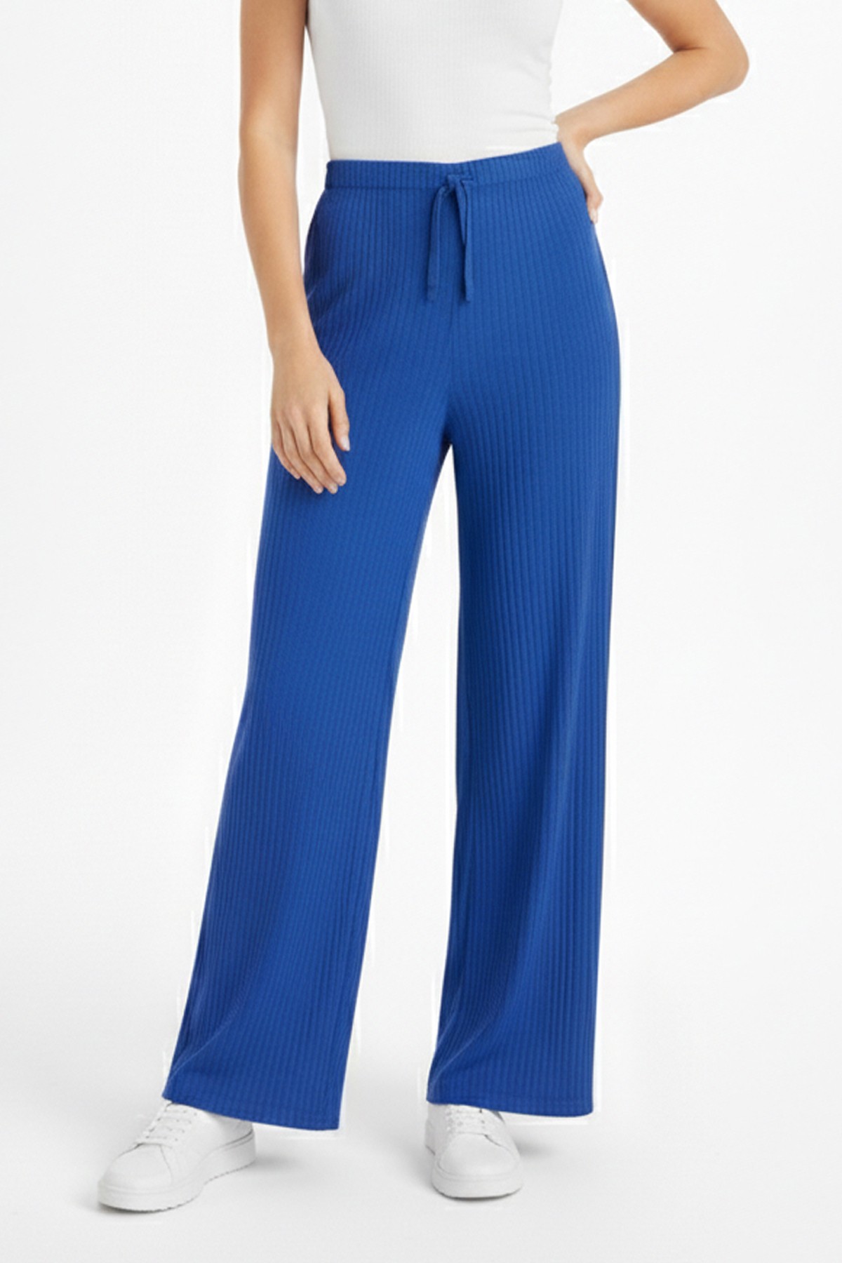 • Kadın Yüksek Bel Fitilli Örme Bağcıklı Esnek Likralı Geniş Paça Pantolon, modern ve rahat tasarımıyla günlük kombinlerin tamamlayıcı parçasıdır.;