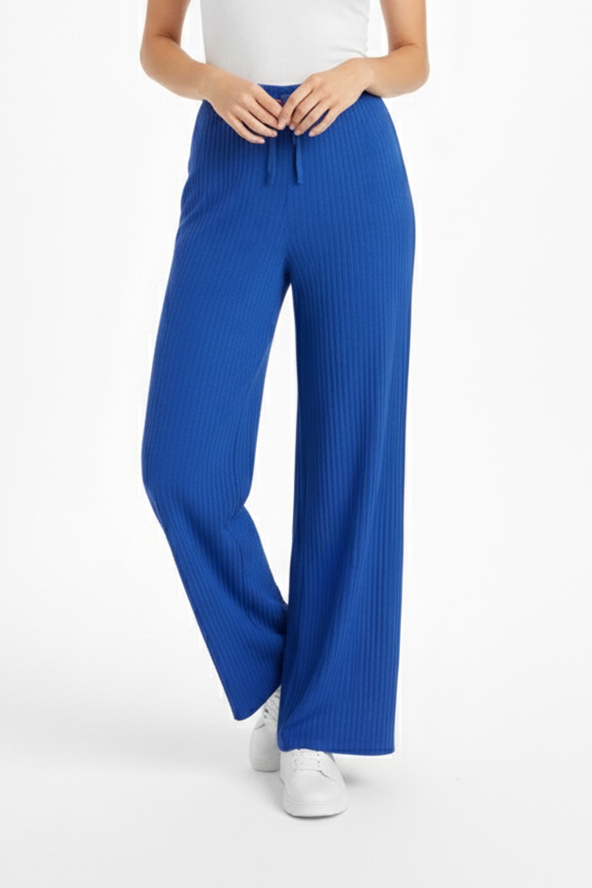 Kadın Saks Mavi Yüksek Bel Fitilli Örme Bağcıklı Esnek Likralı Geniş Paça Pantolon