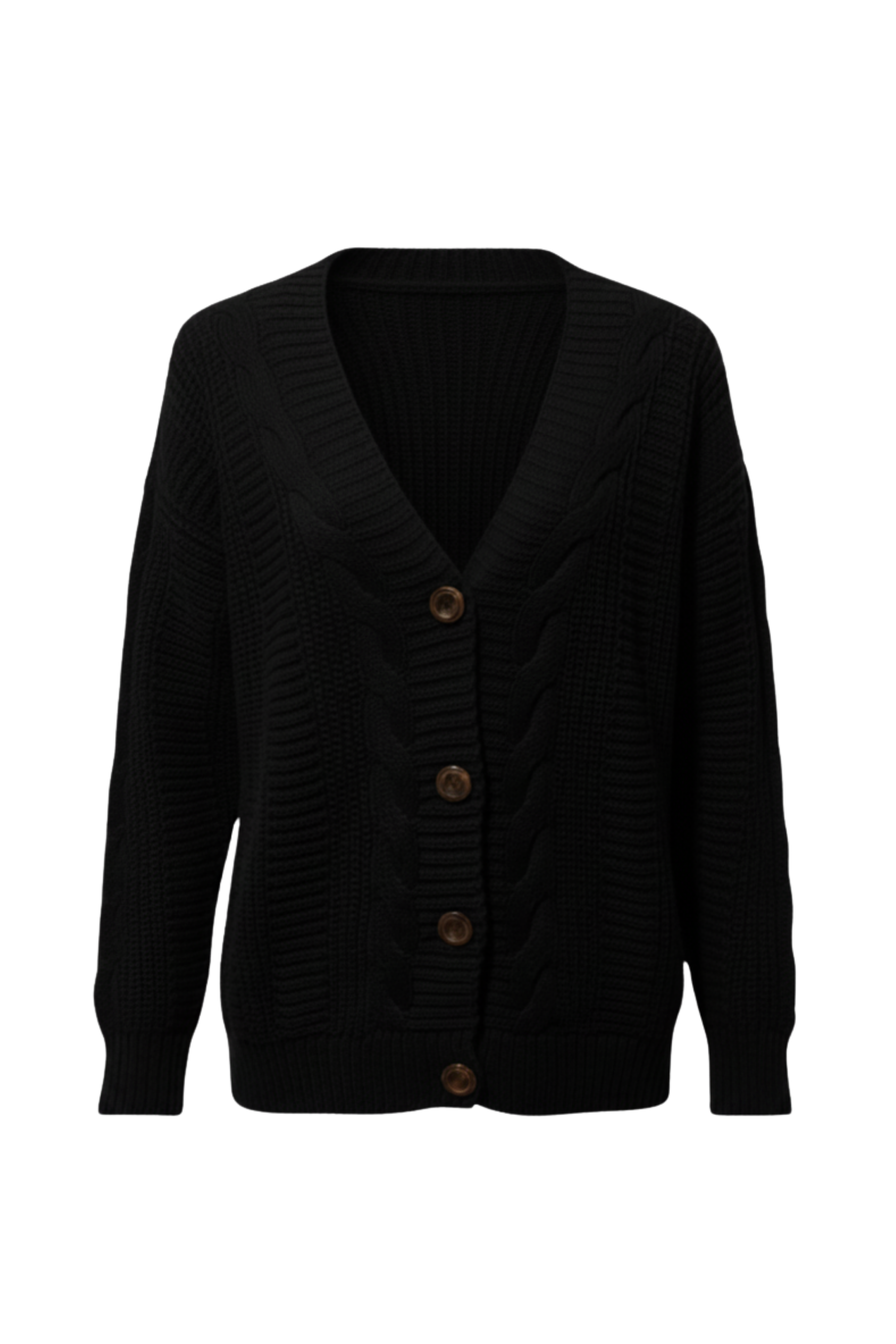 Kadın siyah düğmeli kısa triko hırka, şıklığı ve rahatlığı bir arada sunan zamansız bir parça. Burgulu örgü deseni, klasik hırka stiline zarif bir dokunuş katarken V yaka tasarımı modern ve şık bir görünüm oluşturur. Siyah rengi sayesinde hem casual hem smart-casual kombinlerde kolaylıkla kullanılabilir. Yumuşak dokulu triko yapısı ile soğuk günlerde sıcak tutar, hafif ve esnek yapısıyla gün boyu konfor sağlar.