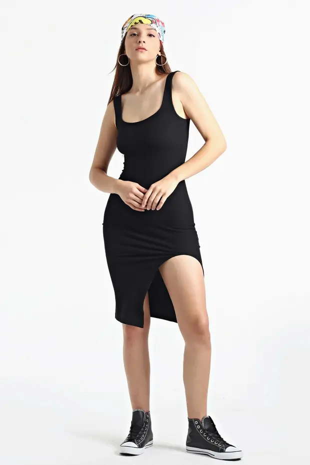 Bele oturan kalıbı, vücut hatlarını zarifçe sararak feminen bir siluet ortaya çıkarırken, yırtmaç detayı hareket özgürlüğü ve modern bir çekicilik kazandırır. Midi boy uzunluğu sayesinde bu elbise, hem günlük kombinlerde hem de özel davetlerde kusursuz bir şıklık sunar.