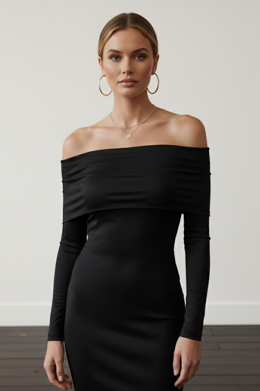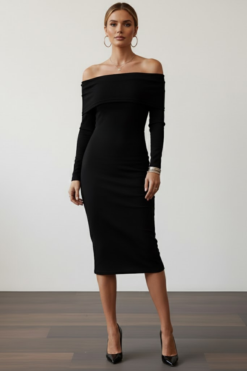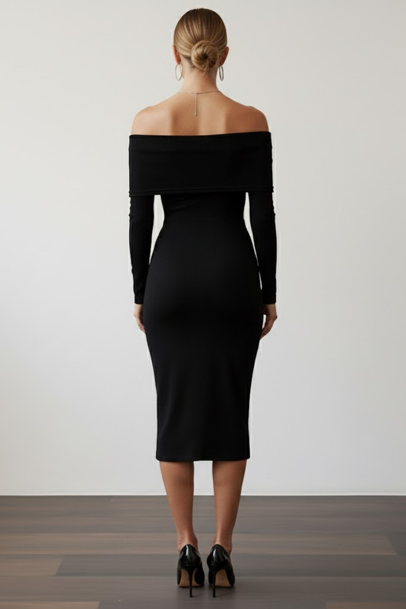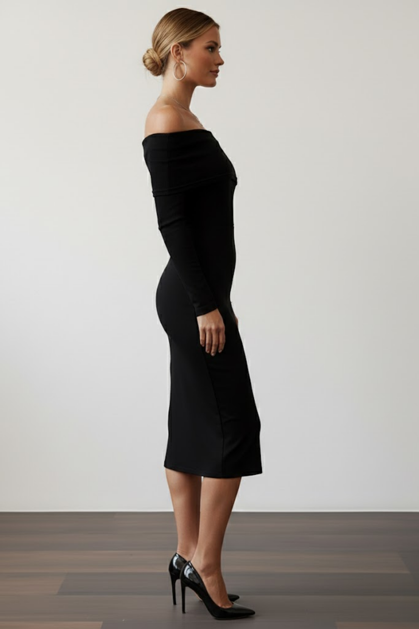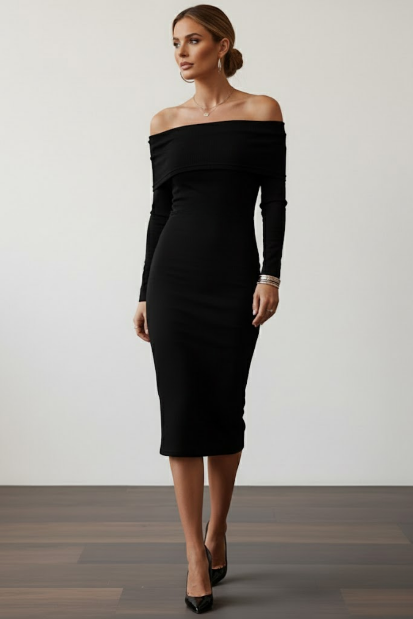 Zamansız Şıklık: Kadın Siyah Madonna Yaka Sandy Kumaş Esnek Midi Boy Uzun Kollu Elbise