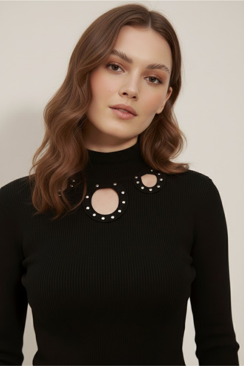 Kadın Siyah Pamuklu Kaşkorse Yarım Balıkçı Yaka Pencere Detaylı Taş İşlemeli Cut Out Bluz