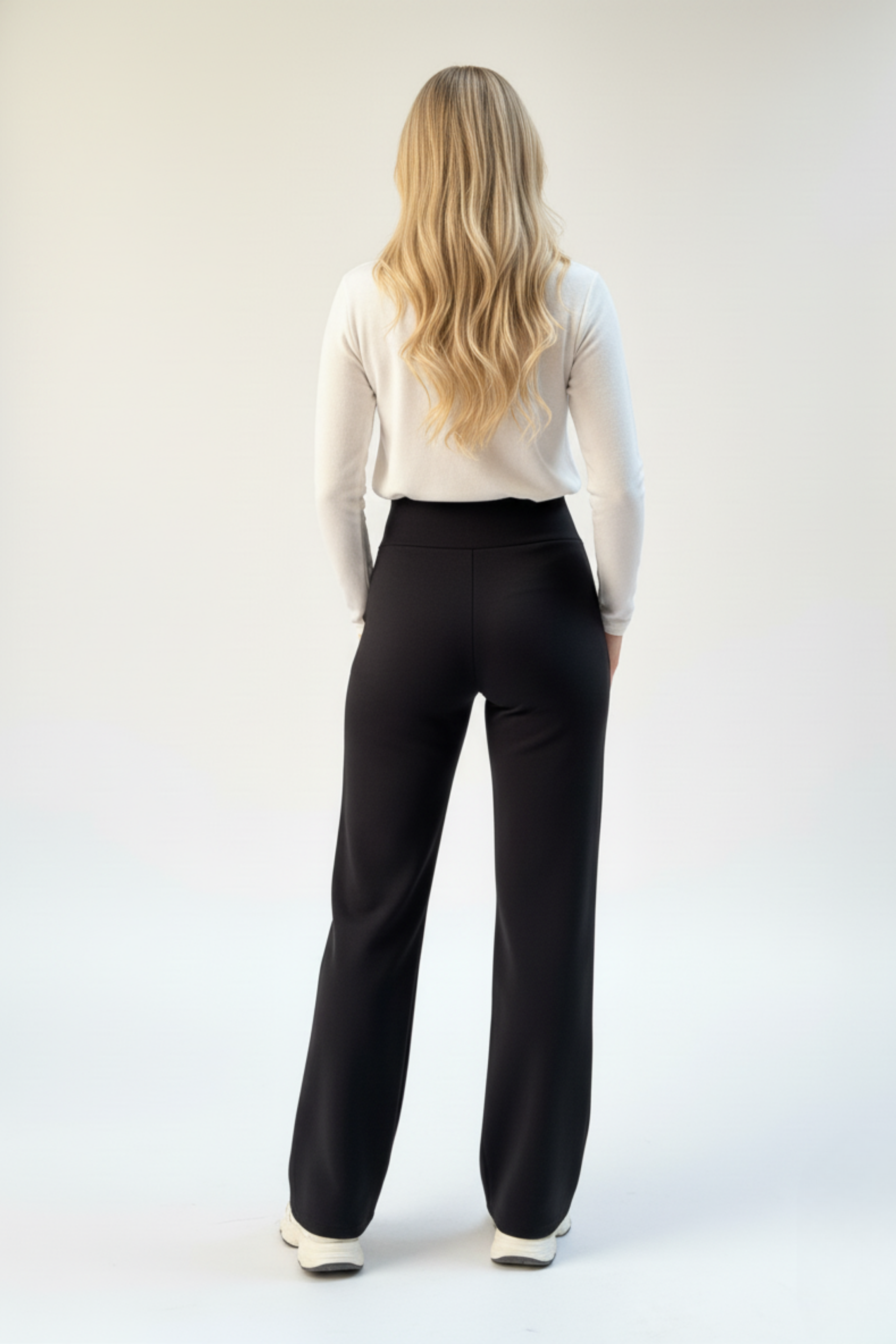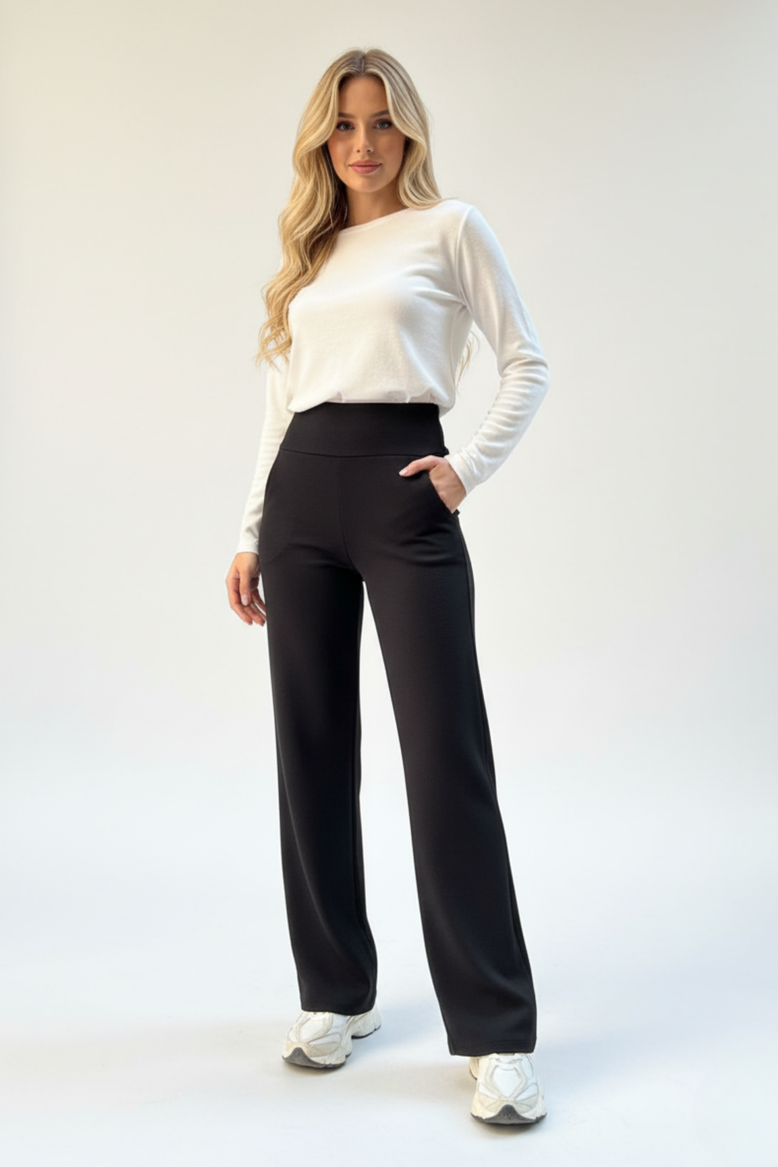 Kadın gardırobunun vazgeçilmez parçalarından biri olan bu siyah krep pantolon, süper yüksek bel tasarımı ve bol kesim modeli ile hem şık hem de rahat bir kullanım sunar. Korsaj detayı, bele zarif bir vurgu katarak pantolona modern bir dokunuş sağlar.