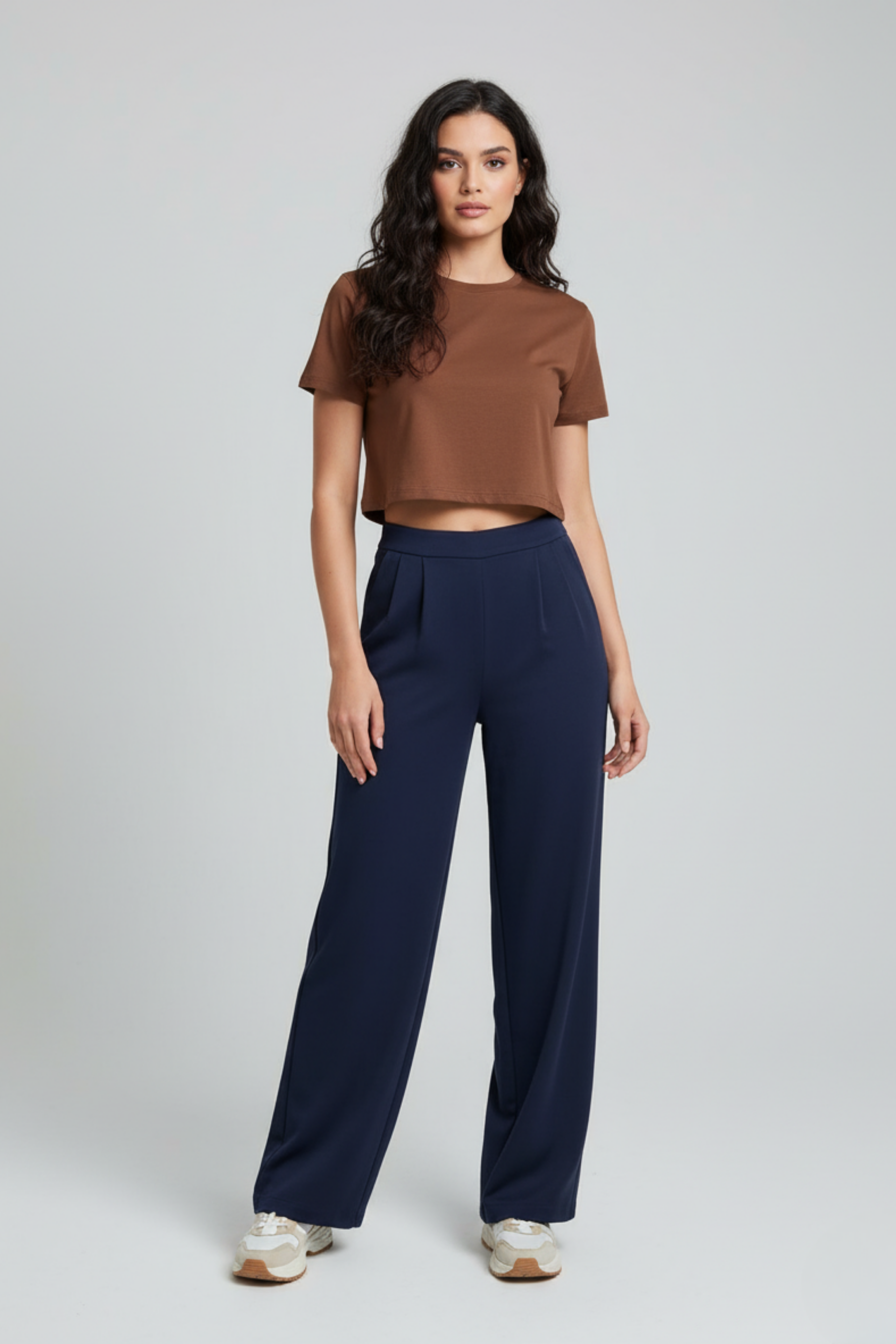 Ön pens detayları pantolona düzgün ve şık bir form kazandırır. Yüksek bel tasarımı bel bölgesini kavrayarak gün boyu konfor sağlar. Krep kumaşı, esnek ve dökümlü yapısıyla hem şıklık hem de rahatlık sunar. Cepsiz ve kemersiz minimalist tasarımı, sade ama etkili bir stil oluşturur. Baskısız yüzeyi, her yaştan kadın için günlük kullanımda idealdir.