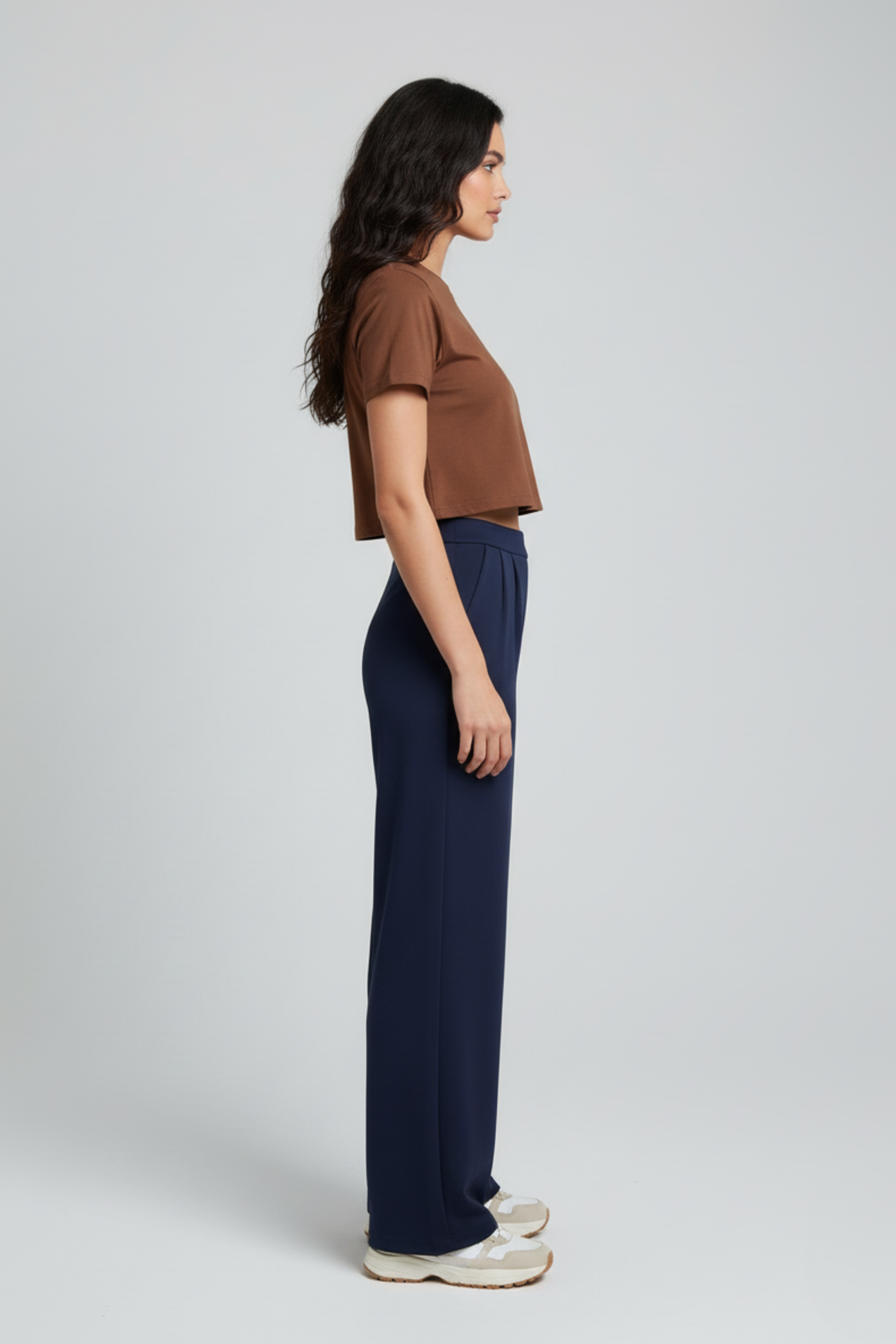 Kadın gardırobunun modern ve zarif parçalarından biri olan bu yüksek bel pensli palazzo pantolon, lacivert rengiyle her kombine uyum sağlar. Bol paça ve palazzo kesimi, bacak boyunu optik olarak uzatırken rahat hareket olanağı sunar.