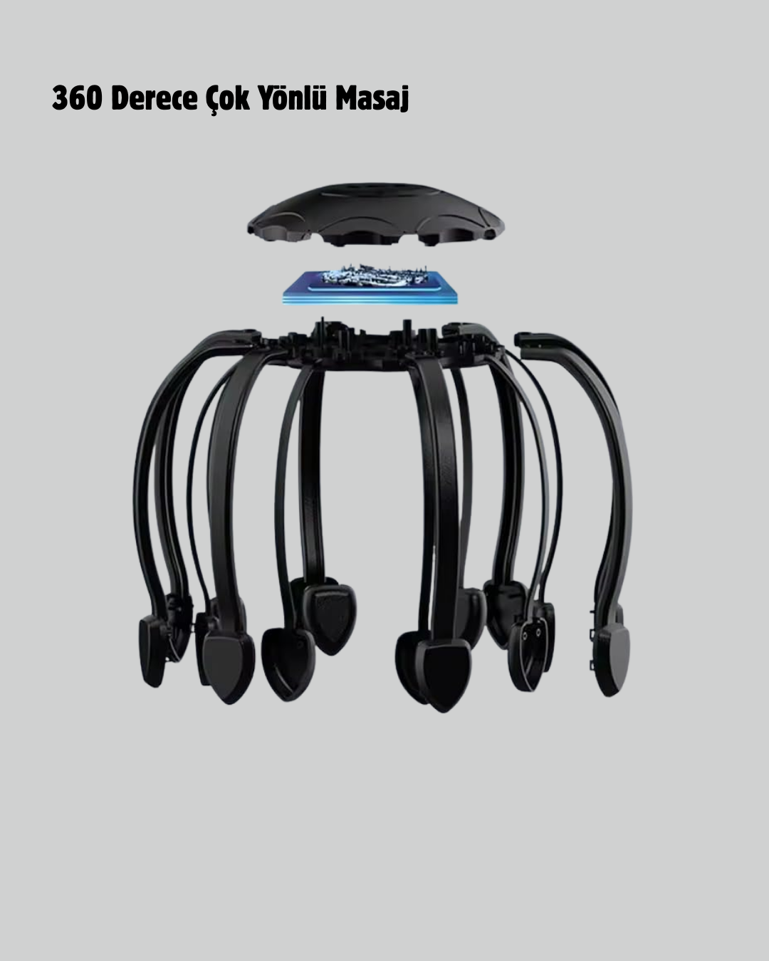Bu elektrikli kafa masaj cihazı, saç derisi ve baş kaslarını tamamen saran yenilikçi 8 motorlu masaj kolları sayesinde günün tüm stresini üzerinizden alır. 360 derece çok yönlü masaj teknolojisi, saçları çekmeden, sıkıştırmadan ve rahatsız etmeden yumuşak ama etkili bir basınç uygular. Özellikle uzun iş günleri, ekran başında çalışma, yoğun tempolu yaşam veya uyku problemleri yaşayanlar için mükemmel bir rahatlama sağlar.Cihazın 8 bağımsız masaj başlığı, saç derisine farklı noktalardan eş zamanlı baskı uygulayarak profesyonel masör etkisi oluşturur. Kan dolaşımını artırır, beyne giden oksijen miktarını yükseltir ve zihinsel yorgunluk hissini azaltır. Böylece hem fiziksel hem mental anlamda yenilenme sunar.Üç farklı masaj modu sayesinde, ister hafif rahatlatıcı bir masaj, ister orta seviye baskılı bir terapi, ister daha yoğun titreşimle derin masaj yapabilirsiniz. Tek tuşla kolay kontrol edildiği için her yaş grubu tarafından rahatlıkla kullanılabilir.USB üzerinden şarj edilebilen yüksek kapasiteli bataryası uzun süreli kullanım sunar. Kablosuz yapısı sayesinde kitap okurken, çalışırken, film izlerken ya da kahvenizi içerken bile eller serbest şekilde masaj yapmaya devam eder. Taşınabilir hafif tasarımı ise seyahatlerde kullanım için büyük avantaj sağlar.Düzenli kullanımda saç derisini rahatlatır, gerginliği azaltır, baş ağrılarını hafifletir ve daha kaliteli uykuya destek olur. Günün sonunda kendinizi ödüllendirmek ve gerçek anlamda rahatlamak isteyen herkes için ideal bir çözümdür.