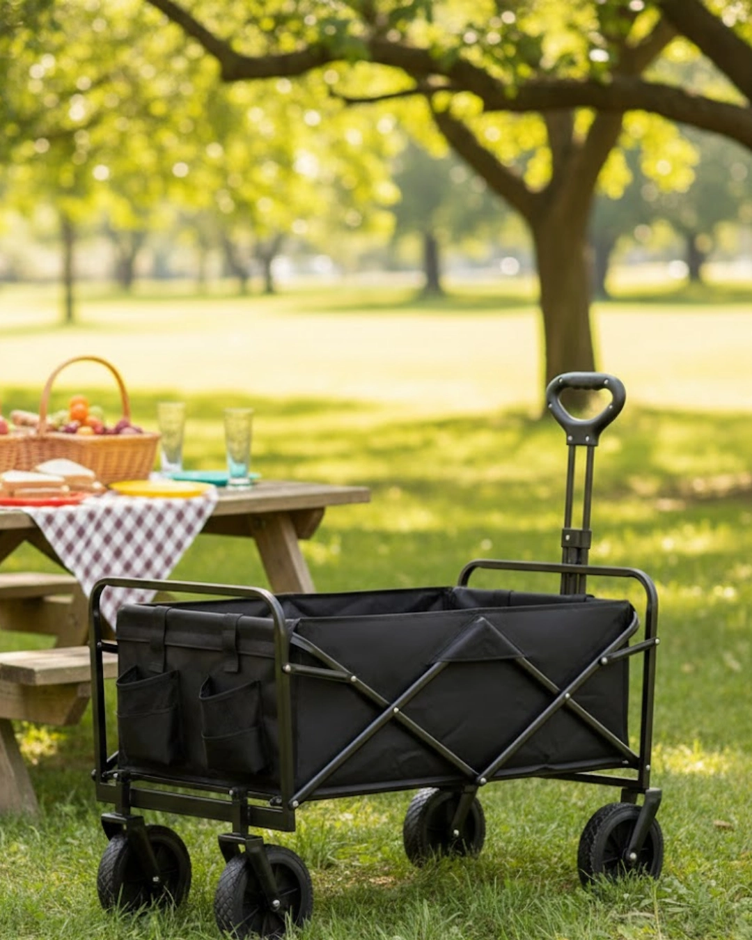 Katlanabilir Taşınabilir Kamp Arabası, açık hava aktivitelerinde, günlük taşıma ihtiyaçlarında ve ev kullanımında pratiklik sunmak üzere tasarlanmış çok yönlü bir taşıma vagonudur. Kamp, plaj, bahçe işleri, alışveriş ve piknik gibi farklı kullanım alanlarında eşyaların zahmetsiz şekilde taşınmasına yardımcı olur. Özellikle hareket halindeyken ağır ve hacimli eşyalarla uğraşmak istemeyen kullanıcılar için ideal bir çözümdür.Katlanabilir Eşya Taşıma Arabası, hareket halindeyken eşyaların kolay ve düzenli şekilde taşınmasını sağlayan fonksiyonel bir vagon modelidir. Kamp ve plaj gibi açık alanlarda olduğu kadar bahçe işleri, alışveriş ve taşınma süreçlerinde de pratik bir çözüm sunar. Kullanıcıyı yormadan taşıma işlemlerini kolaylaştırmak üzere tasarlanmıştır.Ürünün katlanabilir yapısı, en dikkat çekici özelliklerinden biridir. Kullanım sonrası saniyeler içinde katlanarak oldukça küçük bir boyuta gelir. Bu sayede araç bagajında, evde veya depoda rahatça saklanabilir. Montaj gerektirmeyen tasarımı, zaman kaybı yaşamadan hemen kullanıma başlamayı mümkün kılar.74,8 kg maksimum taşıma kapasitesi, ürünü ağır yükler için uygun hale getirir. Geniş iç hacmi sayesinde kamp çantaları, bahçe aletleri, alışveriş torbaları veya spor ekipmanları rahatlıkla taşınabilir. Yan cepler küçük eşyalar için ekstra düzen alanı sunar.360° dönebilen ön tekerlekler, dar alanlarda ve zorlu zeminlerde kolay manevra imkânı sağlar. Kum, çakıl ve çimen gibi farklı yüzeylerde stabil bir kullanım sunar. Arabanın yönünü değiştirmek zahmetsizdir.Ayarlanabilir kulp, farklı boylardaki kullanıcılar için konfor sağlar. Kilitlenebilir yapısı, güvenli sürüş deneyimi sunar. Toz boya kaplı çelik gövdesi sağlamlık kazandırırken, 600D Oxford kumaşı uzun süreli kullanım için dayanıklıdır ve kolay temizlenebilir.Katlanabilir Eşya Taşıma Arabası, pratikliği, dayanıklılığı ve geniş kullanım alanı ile günlük ve açık hava taşıma ihtiyaçları için ideal bir tercihtir.