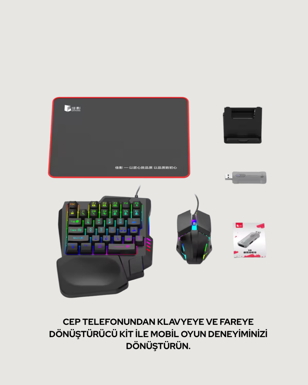 Mobil oyunlara gönül veren herkes bilir ki doğru ekipman, oyunun kaderini belirler. Bu 5in1 set, oyun klavyesi, hassas mouse, mousepad, telefon tutucu ve BT5.3 destekli akıllı dönüştürücüsüyle tam donanımlı bir oyun deneyimi sunar. Üstelik her şey tek pakette – ekstra parça aramanıza gerek yok!RGB aydınlatmalı klavye, sadece estetik değil, aynı zamanda fonksiyonel. Anti-ghosting özelliği sayesinde tüm tuşlar aynı anda çalışır. Kompakt tasarımı ile küçük alanlarda bile rahatlıkla kullanılabilir.Gelişmiş hassasiyete sahip mouse, rekabetçi oyunlarda hedeflerinizi kolayca vurmanızı sağlar. Özellikle FPS oyuncuları için optimize edilmiştir. Mousepad ile birlikte kullanıldığında hareketler çok daha akıcı ve kararlıdır.Bluetooth 5.3 destekli dönüştürücü, güçlü sinyal aktarımı ve düşük gecikme sunar. X8 Pro teknolojisi, karakter hareketlerinizi ve silah kullanımını analiz ederek otomatik optimizasyon sağlar – geri tepme kontrolü sayesinde isabet oranınız artar.Telefon standı ise oyuna odaklanmanızı sağlar. Sabit bir görüş açısıyla el yorgunluğunu azaltır. Uzun süreli oyunlarda şarj bağlantısı kesilmeden kullanabilirsiniz. Taşınabilirliği, kolay kurulumu ve yüksek uyumluluğu ile bu kit, mobil oyuncular için biçilmiş kaftan.