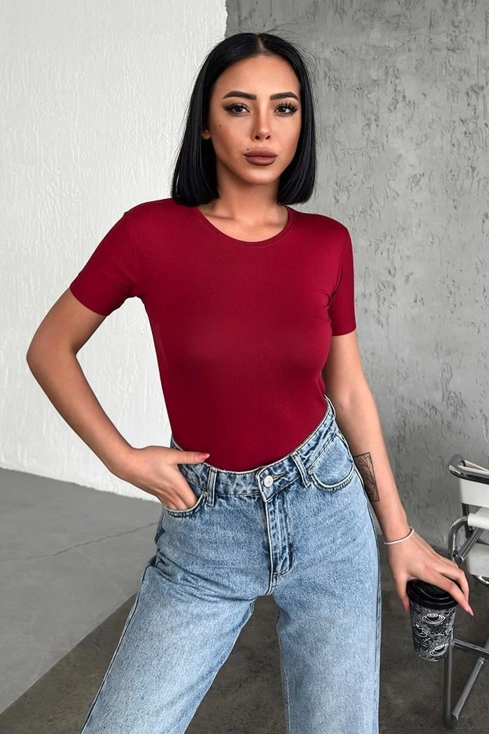 Rahat Ve Şık Kısa Kollu Bisiklet Yaka Likralı Viskon Penye Body Bordo