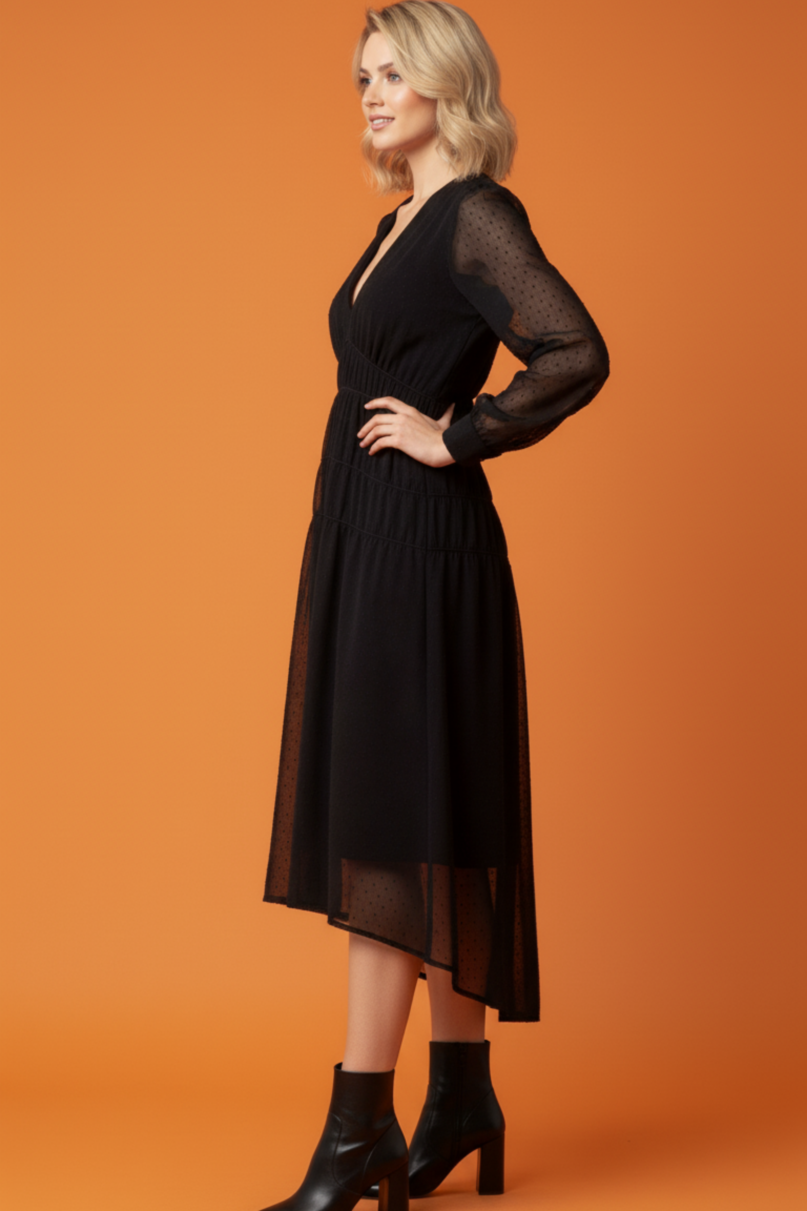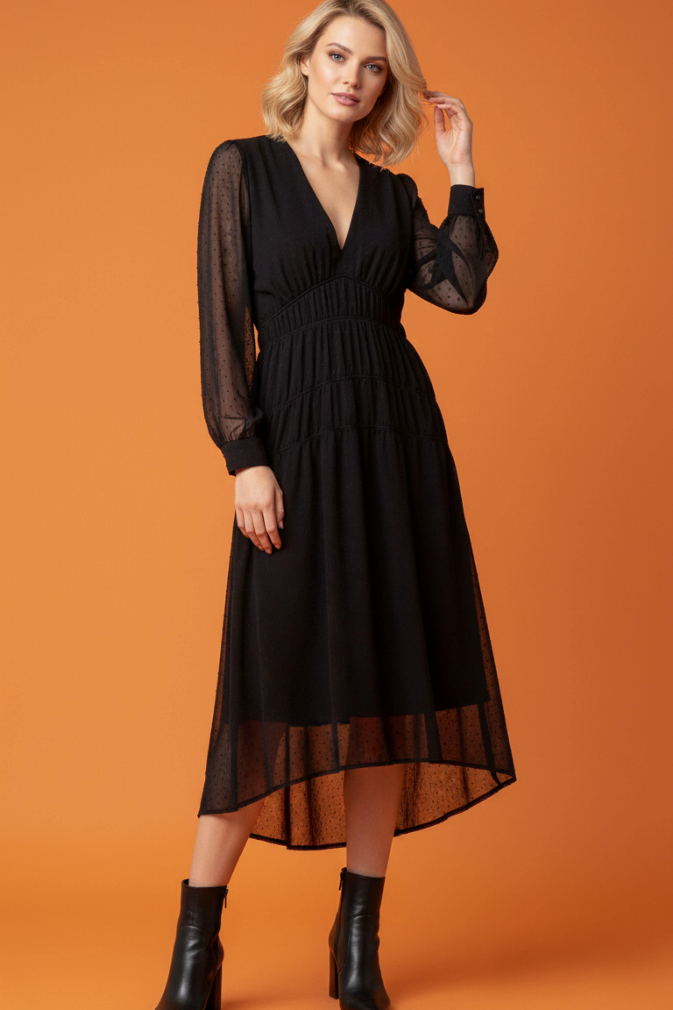 Zarif ve modern detaylarıyla dikkat çeken Siyah Tül Detaylı Büzgülü V Yaka Midi Elbise, her stile uyum sağlayan şık bir parçadır. Transparan tül uzun kolları ve bele oturan büzgülü formu, vücut hatlarını zarifçe vurgularken feminen bir siluet oluşturur. Etek ucundaki ince tül katman, elbiseye hafif ve romantik bir hareket kazandırır. İç kısmındaki yumuşak astar ise konforlu bir kullanım sağlar. Davetlerde, özel günlerde veya akşam şıklığında kolaylıkla tercih edebilirsiniz.