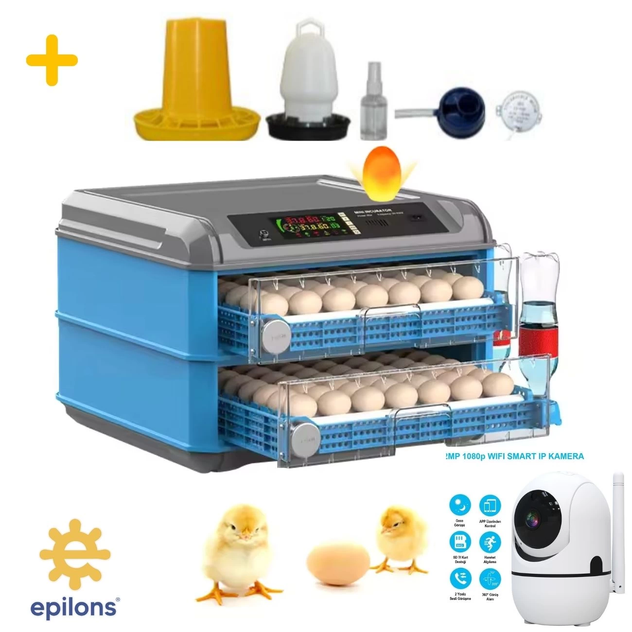 Bu kuluçka makinesi, wifi kamera, yemlik, suluk ve yedek motor hediyesi ile üretime başlamak için ihtiyacınız olan tüm ekipmanı sunar.