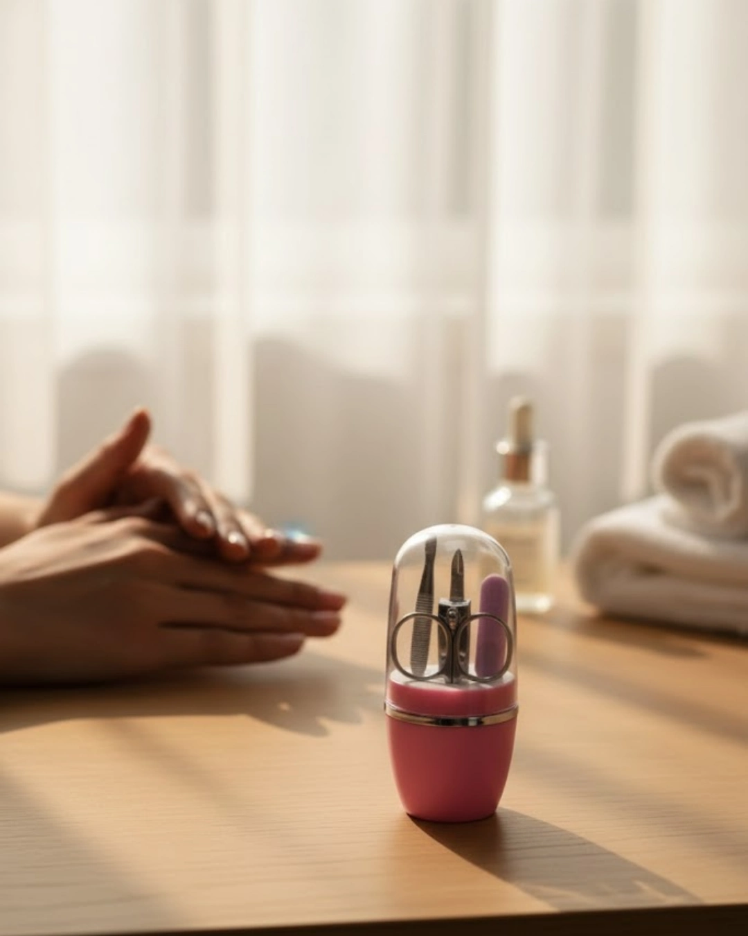 Evde ya da dışarıda tırnak bakımını zahmetsiz hale getiren Tırnak Bakım Manikür Pedikür Seti 4 Parça Pembe, fonksiyonellik ve estetiği bir arada sunar. Günlük bakım ihtiyaçlarını karşılamak üzere özenle seçilmiş tırnak makası, manikür-pedikür makası, cımbız ve törpü ile eksiksiz bir kullanım deneyimi sağlar. Kompakt kapsül tasarımı sayesinde çanta içinde yer kaplamaz ve her an elinizin altında olur.Pembe rengiyle feminen ve modern bir görünüm sunan bu set, sade ama şık tasarımıyla dikkat çeker. Şeffaf üst kapak, içindeki ürünleri net şekilde görmenizi sağlarken hijyenik bir saklama alanı oluşturur. Paslanmaz çelikten üretilmiş metal parçalar, uzun ömürlü kullanım ve hassas kesim avantajı sunar.Evde kişisel bakım rutininizi tamamlamak, seyahatlerde pratik bir çözüm elde etmek ya da çantanızda düzenli bir bakım seti taşımak isteyenler için idealdir. Minimal boyutu sayesinde çekmecede, makyaj çantasında veya valizde rahatlıkla saklanabilir. Hem es hem işlevsel olması, ürünü günlük kullanım için vazgeçilmez kılar.