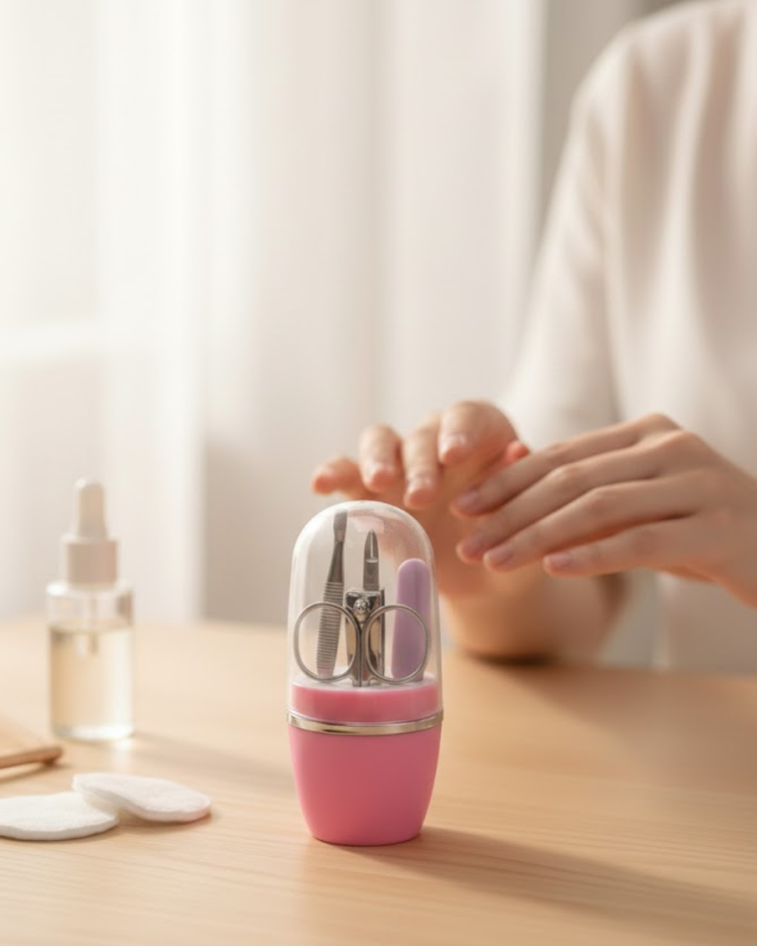 Kişisel bakımda pratiklik arayanlar için tasarlanan Tırnak Bakım Manikür Pedikür Seti 4 Parça Pembe, şık kapsül kutusu ve kullanışlı içeriğiyle öne çıkar. Set içerisinde yer alan tırnak makası, manikür pedikür makası, cımbız ve törpü, el ve ayak bakımınızı eksiksiz şekilde yapmanıza yardımcı olur.Dayanıklı metal yapıya sahip ürünler, düzenli kullanımda bile formunu korur. Törpü, tırnak yüzeyini pürüzsüz hale getirirken; cımbız hassas tutuş sağlar. Makaslar ise kontrollü ve düzgün kesim imkânı sunar. Tüm parçalar kapsül içinde düzenli şekilde yerleştirilmiştir, dağınıklık yaratmaz.Pembe rengi sayesinde klasik bakım setlerinden ayrılan bu ürün, görsel olarak da keyifli bir kullanım sunar. Banyoda, yatak odasında veya seyahat çantasında rahatça taşınabilir. Günlük bakım rutinini düzenli ve konforlu hale getirmek isteyenler için ideal bir tercihtir.