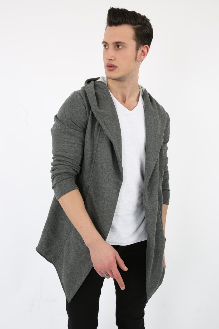 Üç İplik Şardonlu Kapşonlu Cepli Erkek Günlük Panço Hırka