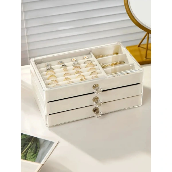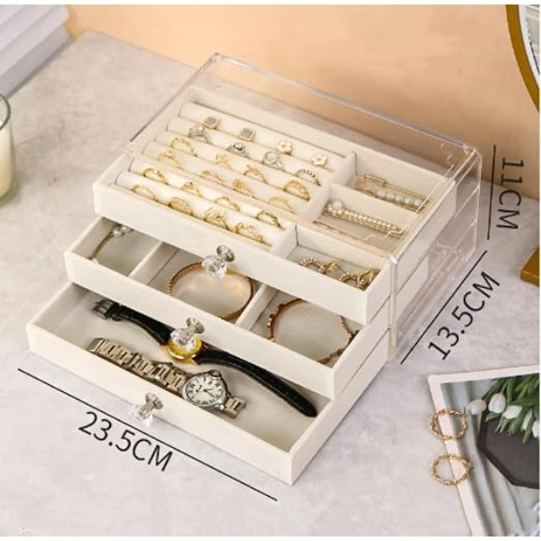 KESGİN MARKET®ÜÇ KATLI TAKI ORGANİZERİÜrün ÖzellikleriÜç Katlı Takı Organizeri, üç katlı çekmeceli tasarımı ile farklı türdeki takıların (yüzük, küpe, kolye, bileklik vb.) ayrı ayrı saklanmasına olanak tanır. Kadife kaplı iç bölmeler, takıların çizilmesini önler ve şık bir sunum sağlar. Saydam akrilik dış kapak, tozlanmayı engellerken içeriğin kolayca görünmesini sağlar. Kristal görünümlü çekmece kulpları ise dekoratif bir detay olarak tasarıma zarafet katar. Çok gözlü iç yapısı, küçük aksesuarların karışmadan düzenli bir şekilde durmasını sağlar. Bu düzenleyici kutular, hem evde takı organizasyonu sağlamak hem de makyaj masası veya komodin üzerinde dekoratif bir görünüm oluşturmak için idealdir.Paket İçeriği1 Adet Üç Katlı Takı Organizeri