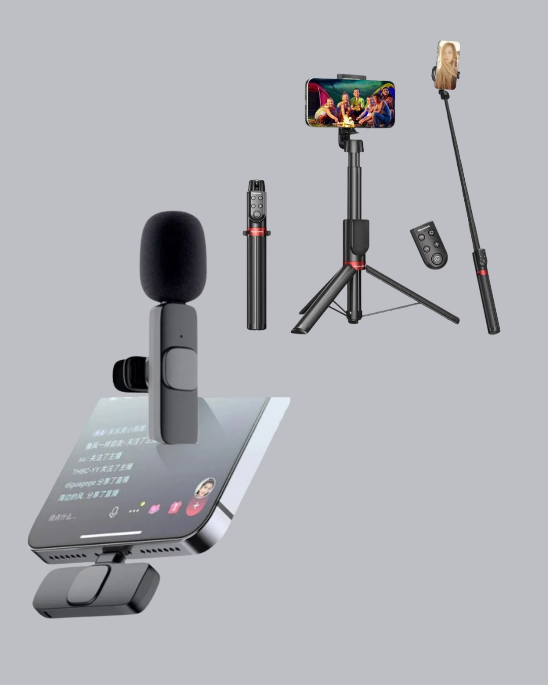 Vlog Ve Canlı Yayın İçin Çift Yaka Mikrofonu Ve Tripodlu Selfie Çubuğu Seti