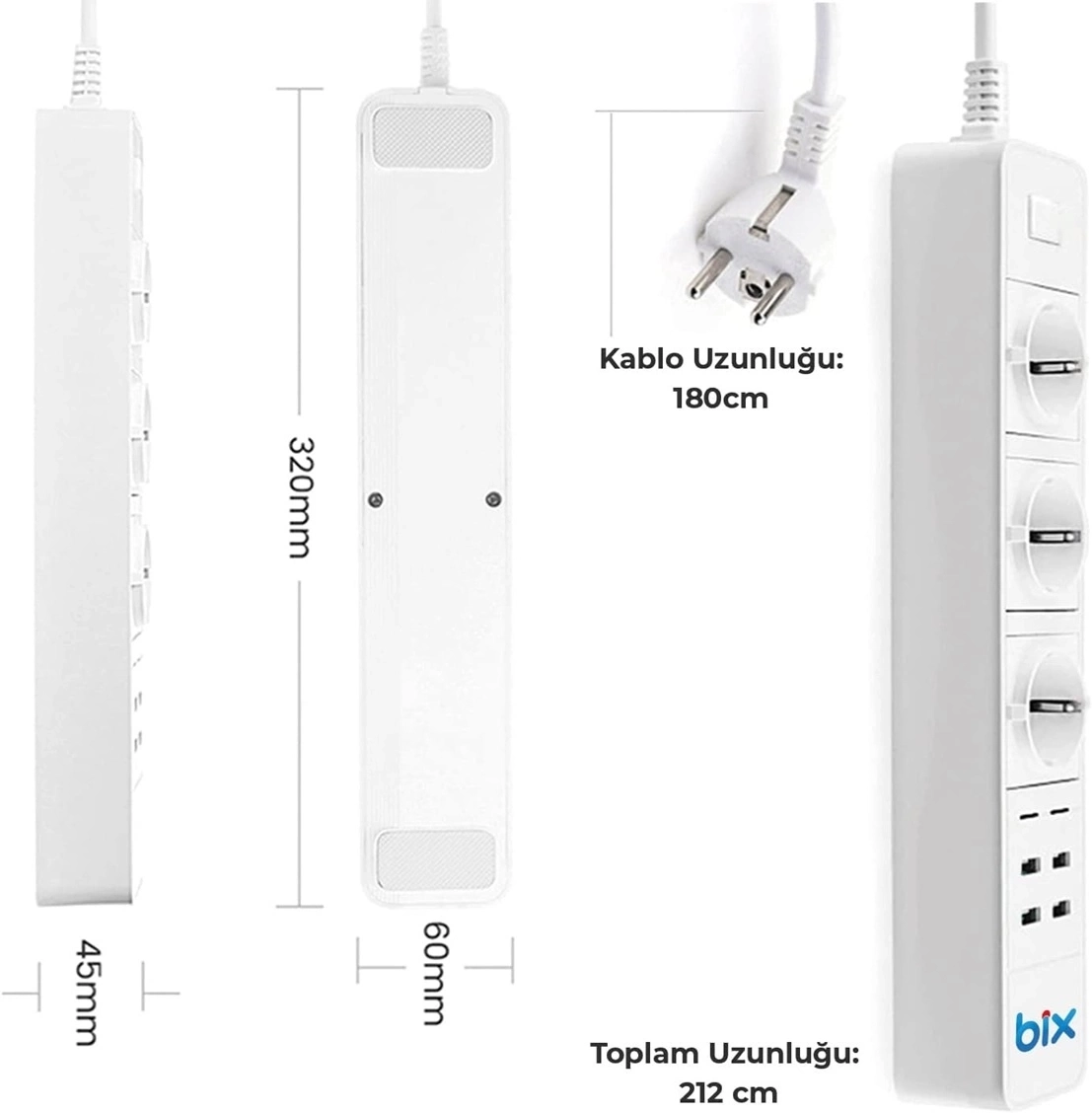 KESGİN MARKET® Akım Korumalı 2’li Ayrı Anahtarlı Priz, 2x Priz, 3x Usb, 1x Type-c, 2 Mt Kablo, Hızlı Şarj