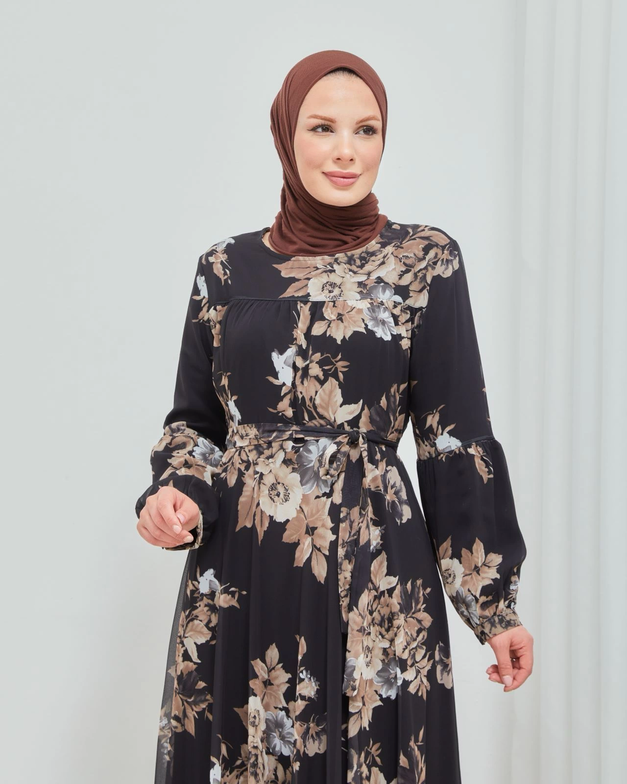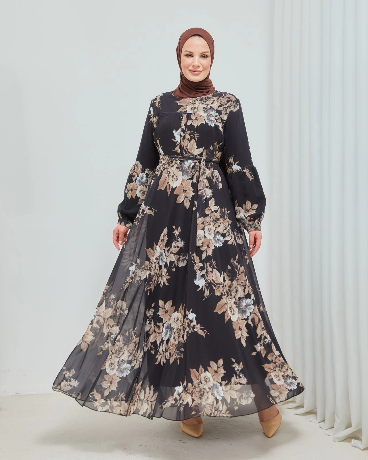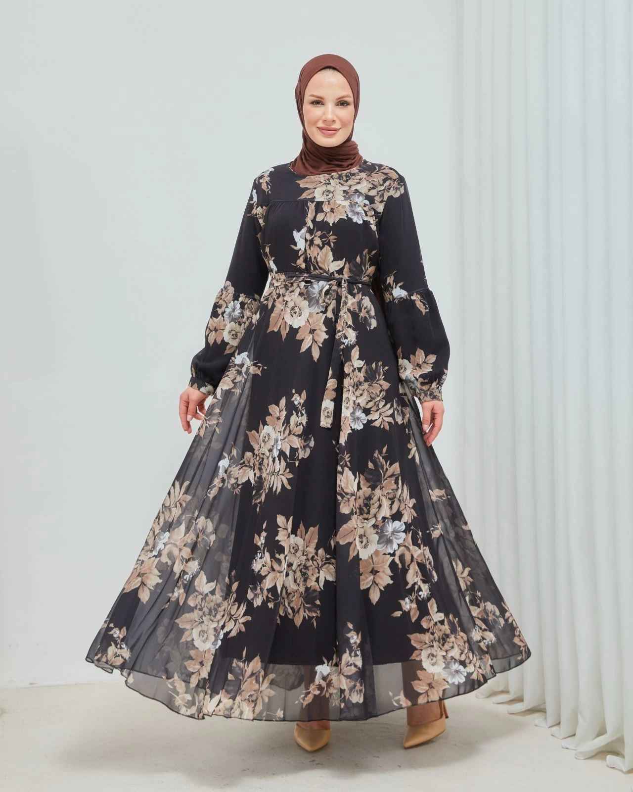 Yaprak Desenli Zarif ve Şık Uzun Boy Büyük Beden Astarlı Şifon Elbise