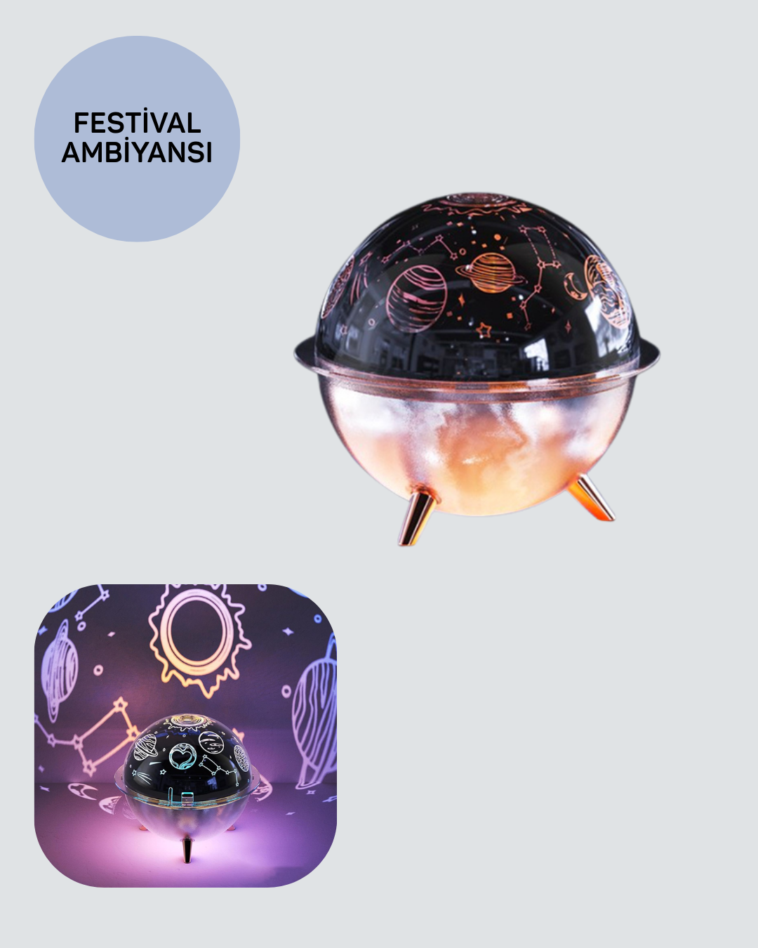 Yıldızlı gökyüzü ve galaksi efektleri sunan bu uzay temalı nemlendirici lamba, dekoratif aydınlatma ile hava kalitesini bir arada sunar. USB’den güç alarak çalışması, ürünü hem ekonomik hem de pratik hale getirir.Projeksiyon ışıkları, tavana ve duvarlara yansıyarak gerçekçi bir uzay atmosferi oluşturur. Meditasyon, yoga ve uyku öncesi kullanım için sakinleştirici bir ortam sağlar. Çocukların hayal dünyasını zenginleştirirken yetişkinler için de rahatlatıcı bir deneyim sunar.Nemlendirme özelliği sayesinde kuru havanın olumsuz etkilerini azaltır. Yatak odaları, oturma odaları ve çalışma alanları için uygundur. Uzay temasını sevenler için fonksiyonel bir dekoratif üründür.