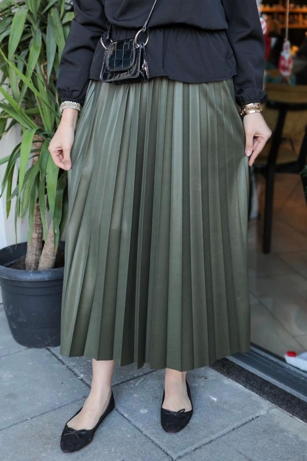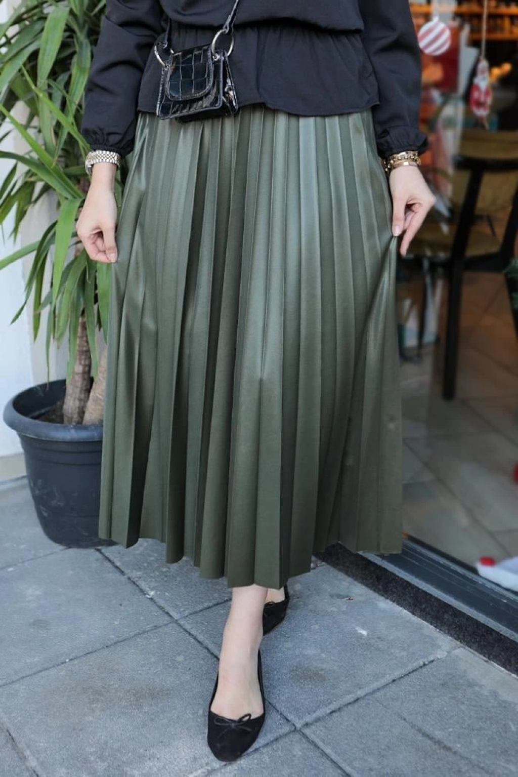 -Pileli detaylar, eteğe hareket ve hacim katarken aynı zamanda feminen bir dokunuş sağlar. Bu detaylar, eteğin tarzını ve çekiciliğini artırır, böylece her kombinde dikkat çekici bir seçenek haline gelir. Haki rengi, doğallık ve sofistike bir tarzı yansıtır.