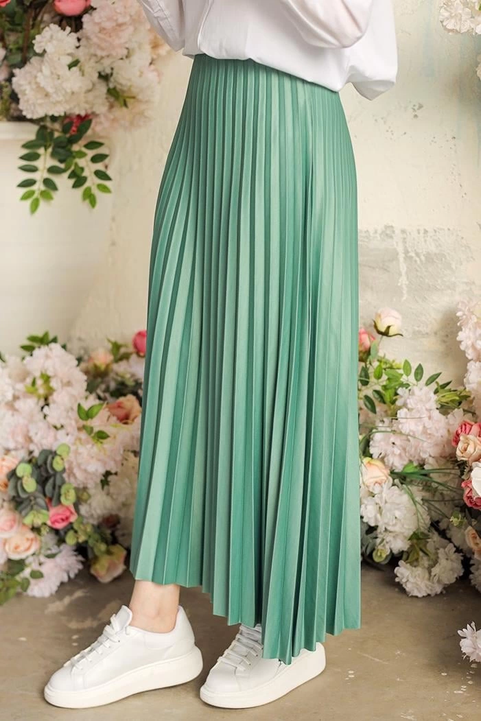 Zarif ve Modern Pileli Parlak Krep Gizli Lastikli Mint Etek