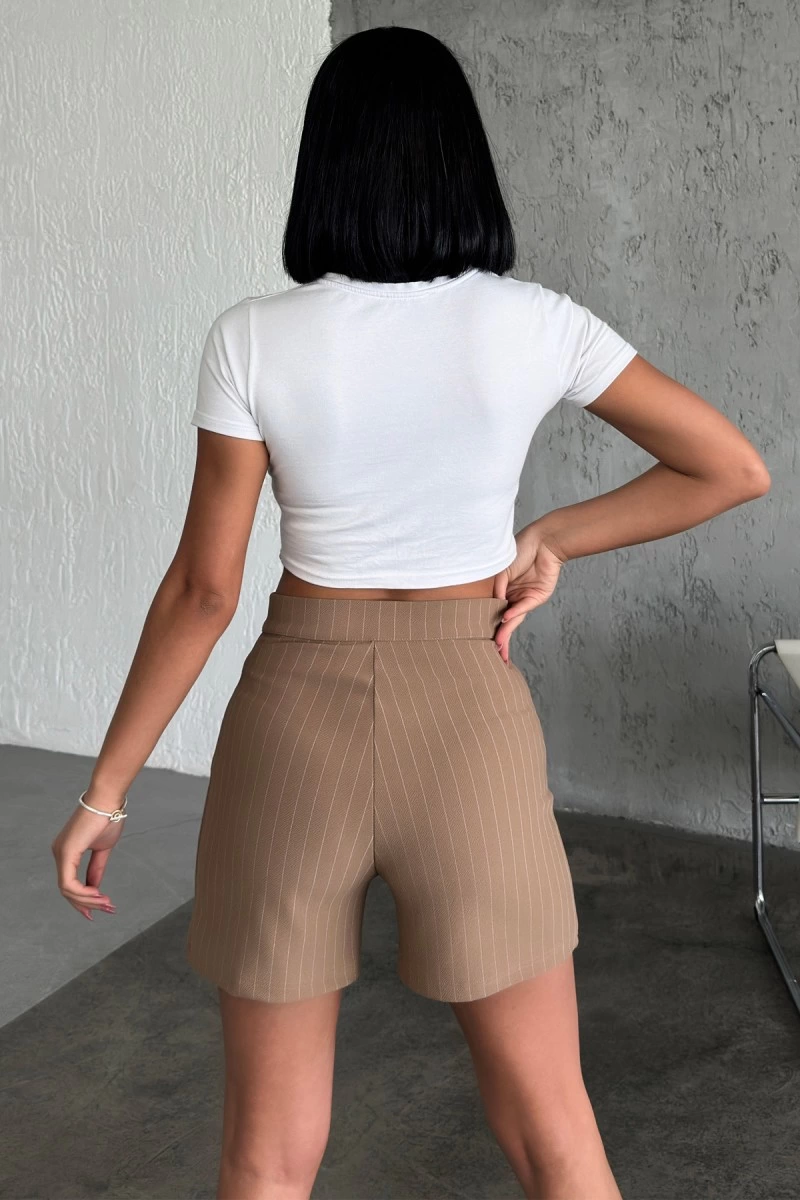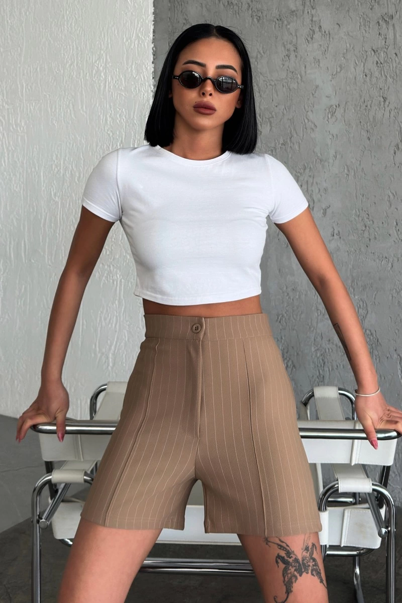 Zarif ve Şıklığı Bir Arada Sunan Yüksek Bel Krep Esnek Çimalı Çizgili Şort Bej -Yüksek bel tasarımıyla vücudu saran ve zarif bir görünüm sunan, krep çımalı çizgili şort bej rengiyle gardırobunuzu güncelleyin. Bu şort, esnek likralı kumaşıyla hareket özgürlüğü ve konfor sunarken, şık çımalı çizgileriyle de tarzınızı tamamlayacak.