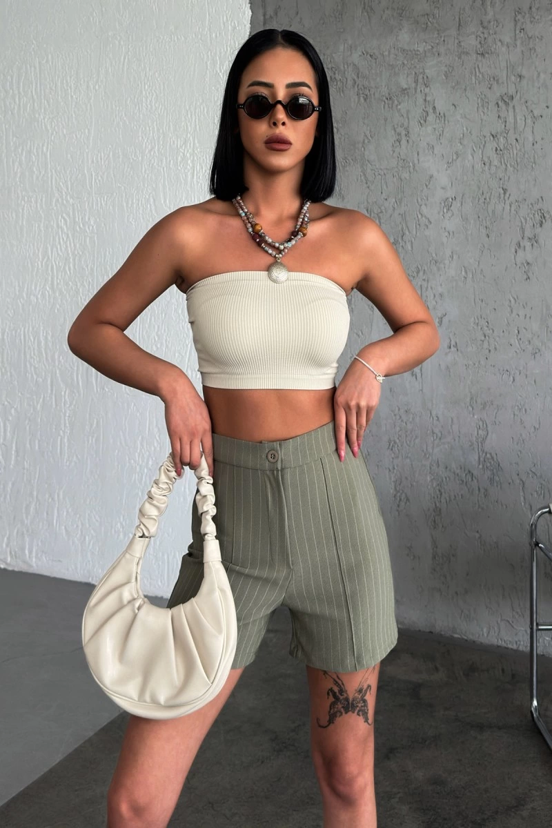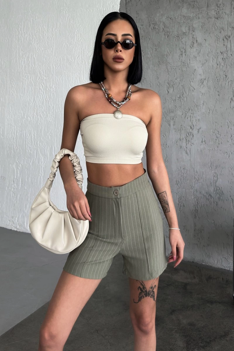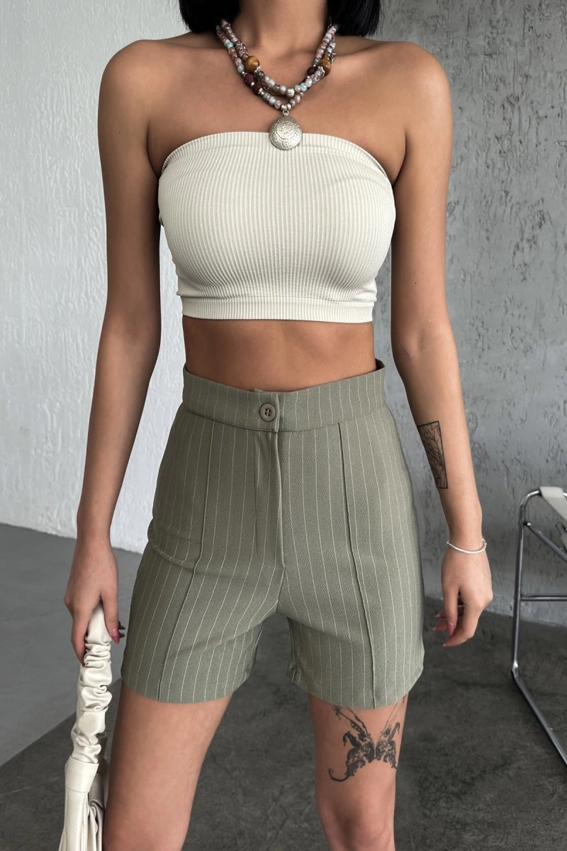 Zarif ve Şıklığı Bir Arada Sunan Yüksek Bel Krep Esnek Çimalı Çizgili Şort Haki