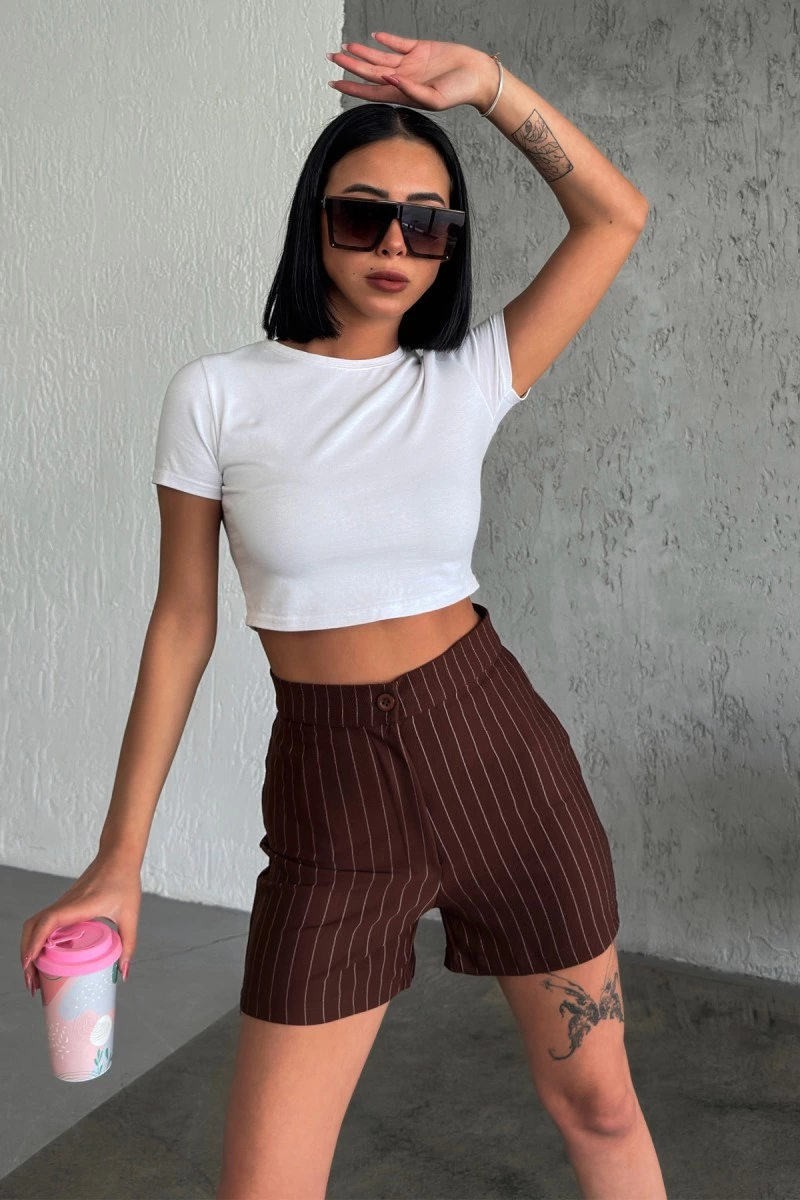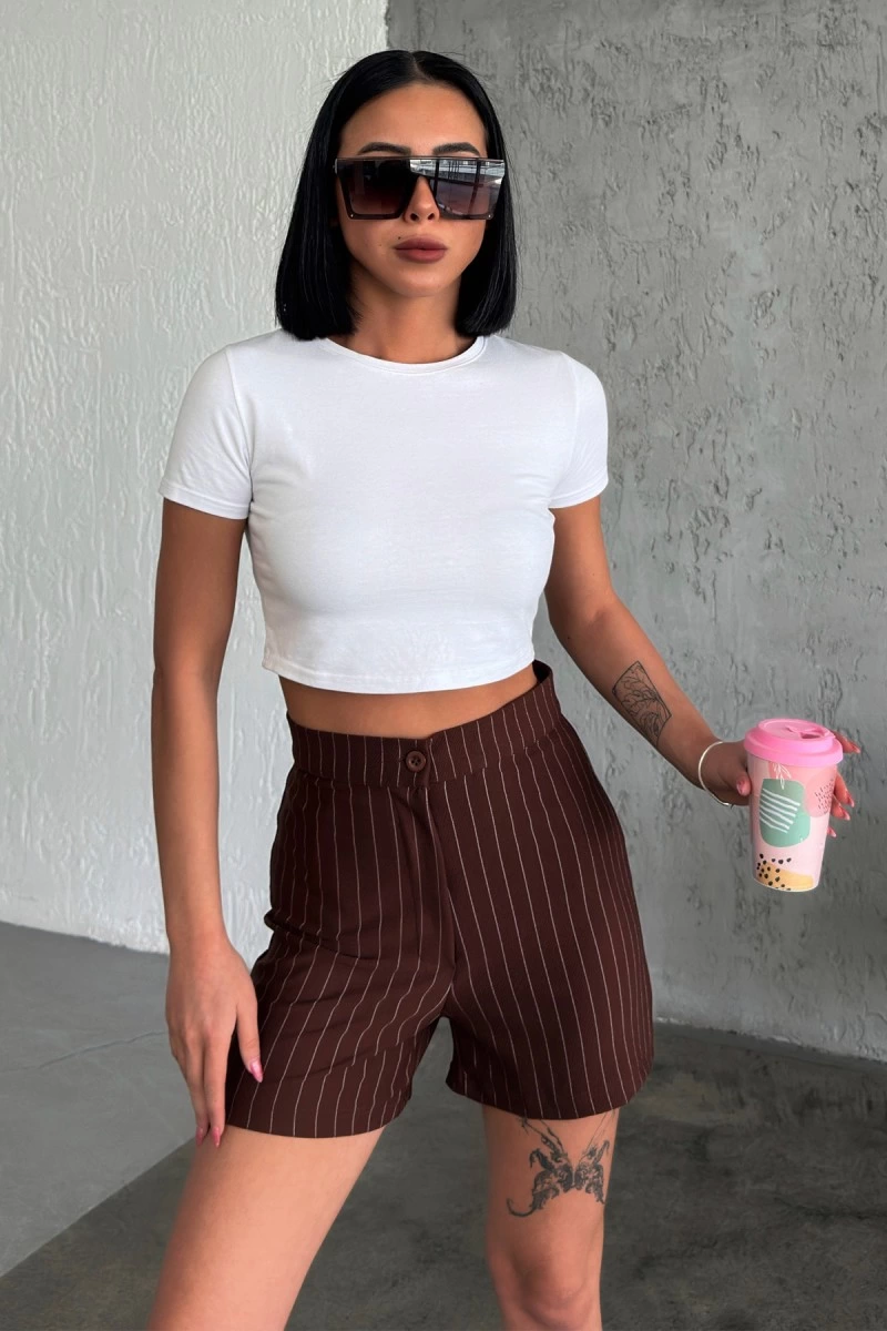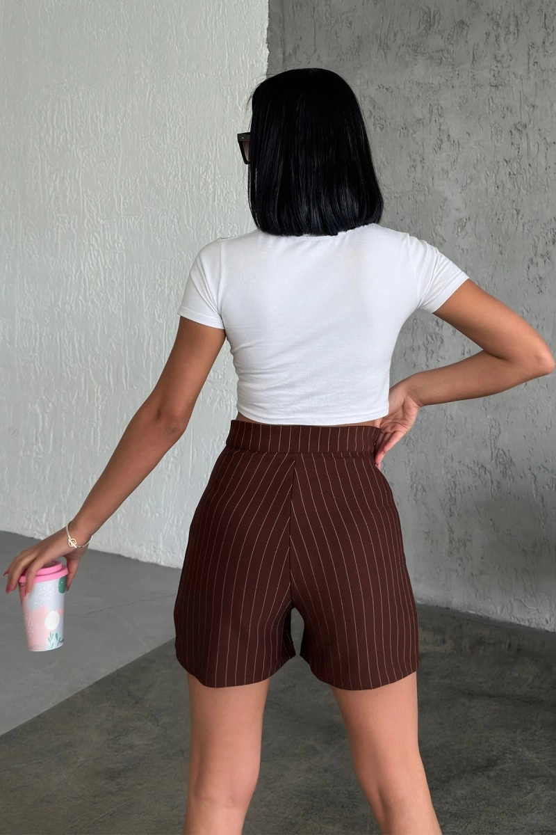 Zarif ve Şıklığı Bir Arada Sunan Yüksek Bel Krep Esnek Çimalı Çizgili Şort Kahverengi