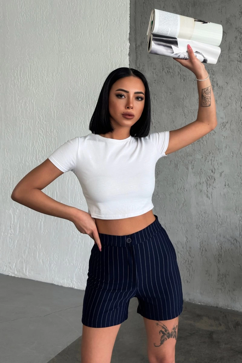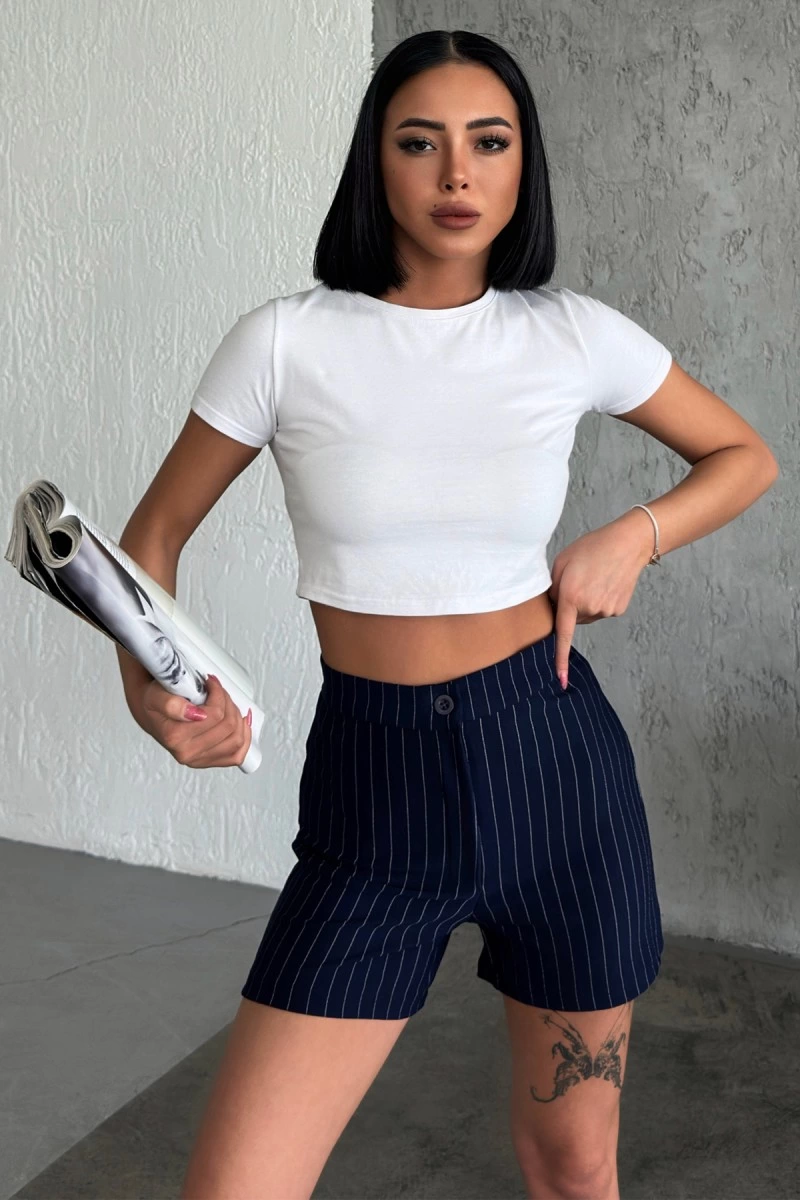Zarif ve Şıklığı Bir Arada Sunan Yüksek Bel Krep Esnek Çimalı Çizgili Şort Lacivert